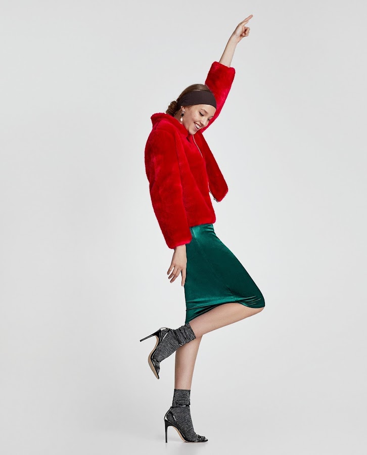 También podéis encontrar este vestido de terciopelo verde con un abrigo de pelo rojo, súper tendencia este invierno.