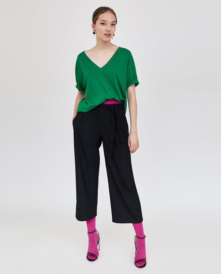 En Zara mezclan una camiseta básica verde de cuello de pico con unos calcetines morados. Para suavizar añaden los pantalones negros. Un look muy sencillo para inspirarse.