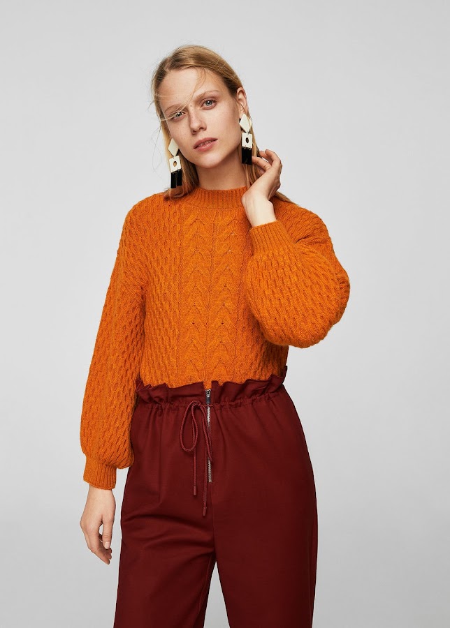 En Mango también se atreven con las mezclas arriesgadas. Por ejemplo encontramos un jersey de ochos naranja combinado con un pantalón en color cereza.