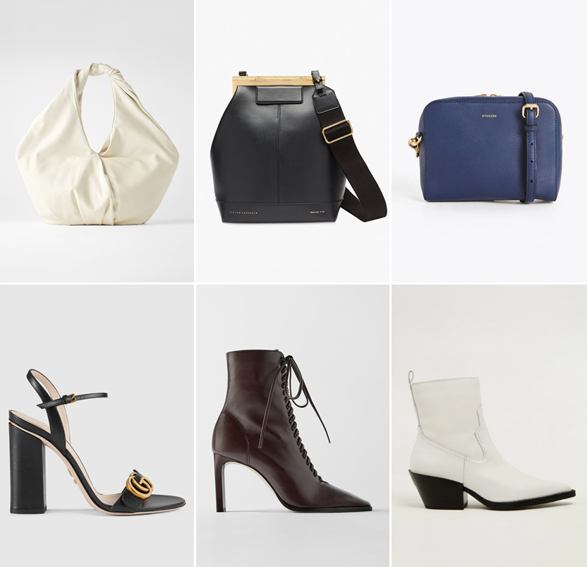 En orden: Bolsos de cuero de Zara (99.95€) Victoria Beckham (1790.00€) y Uterqüe (79.00€) y zapatos de cuero de Gucci (595.00€) Zara (79.95€) y Mango (79.99€)