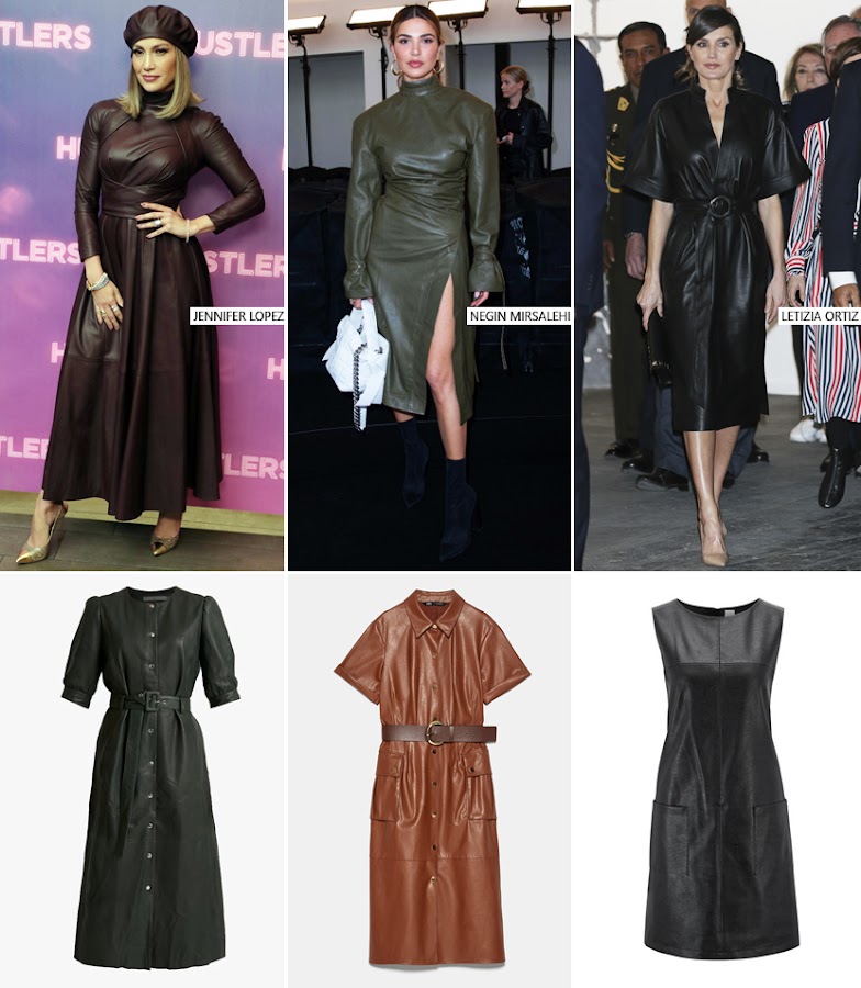 En orden: Vestidos de cuero de Gestuz (439.99€) Zara (39.95€) y BOSS (160.00€)