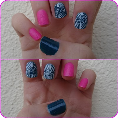 5. Damos top coat en las uñas verdes, en las rosas no porque se perdería el efecto arena del esmalte.