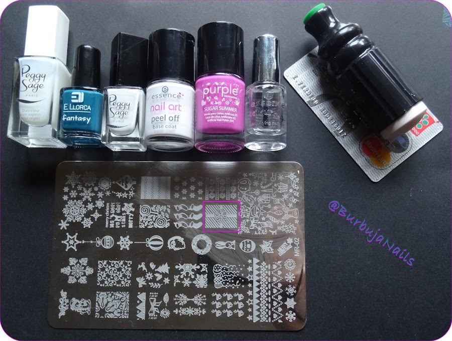 3. En la uña del índice y del corazón estampamos el diseño del regalo en color blanco. Como el diseño es un poquito grande he utilizado la técnica de aumentar o reducir el diseño con el sello que es súper fácil y por si no sabéis como hacerlo aquí os dejo un vídeo de Todos Los Esmaltes Son Pocos.