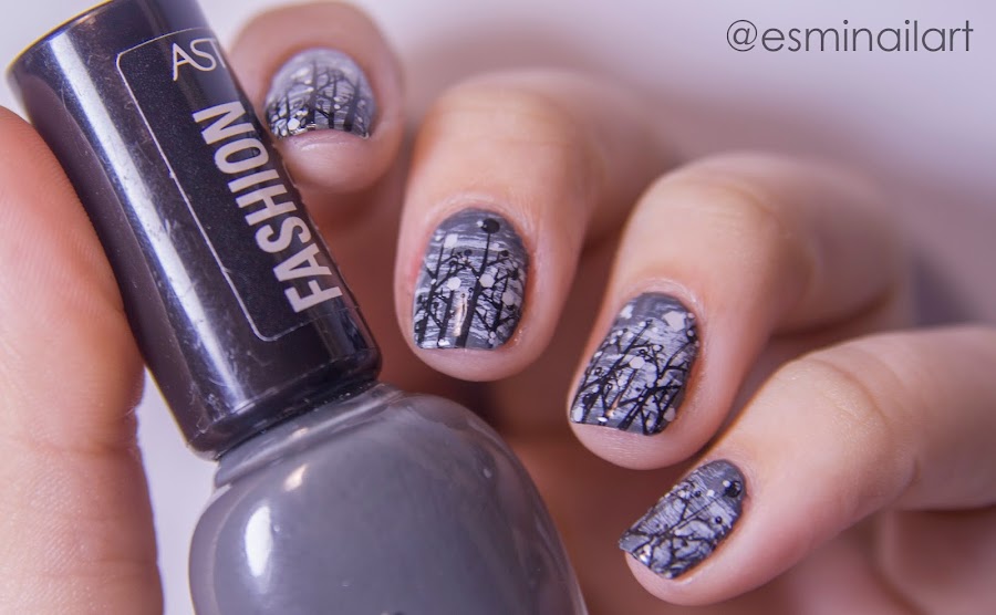 Los esmaltes utilizados para la manicura son el 270 Powerful King de los Fashion Studio de Astor, el esmalte 33 Wild white ways de la gama Gel de Essence, un topper con glitter hexagonal blanco de varios tamaños (no le encuentro numeración) de Yes Love y un esmalte negro para estampar (utilicé uno de Yes Love, que es muy denso).
