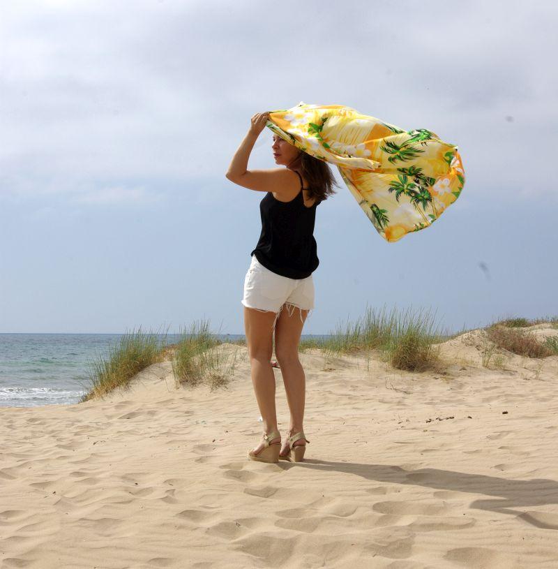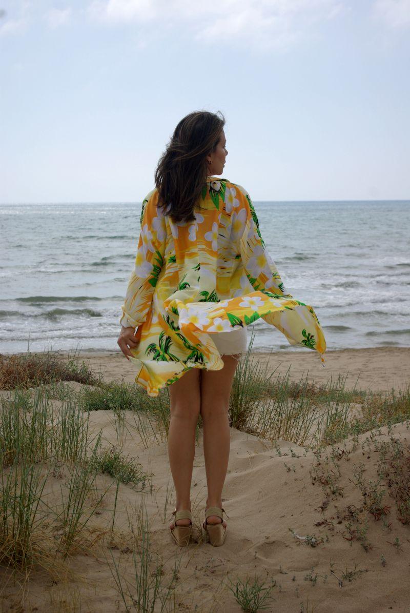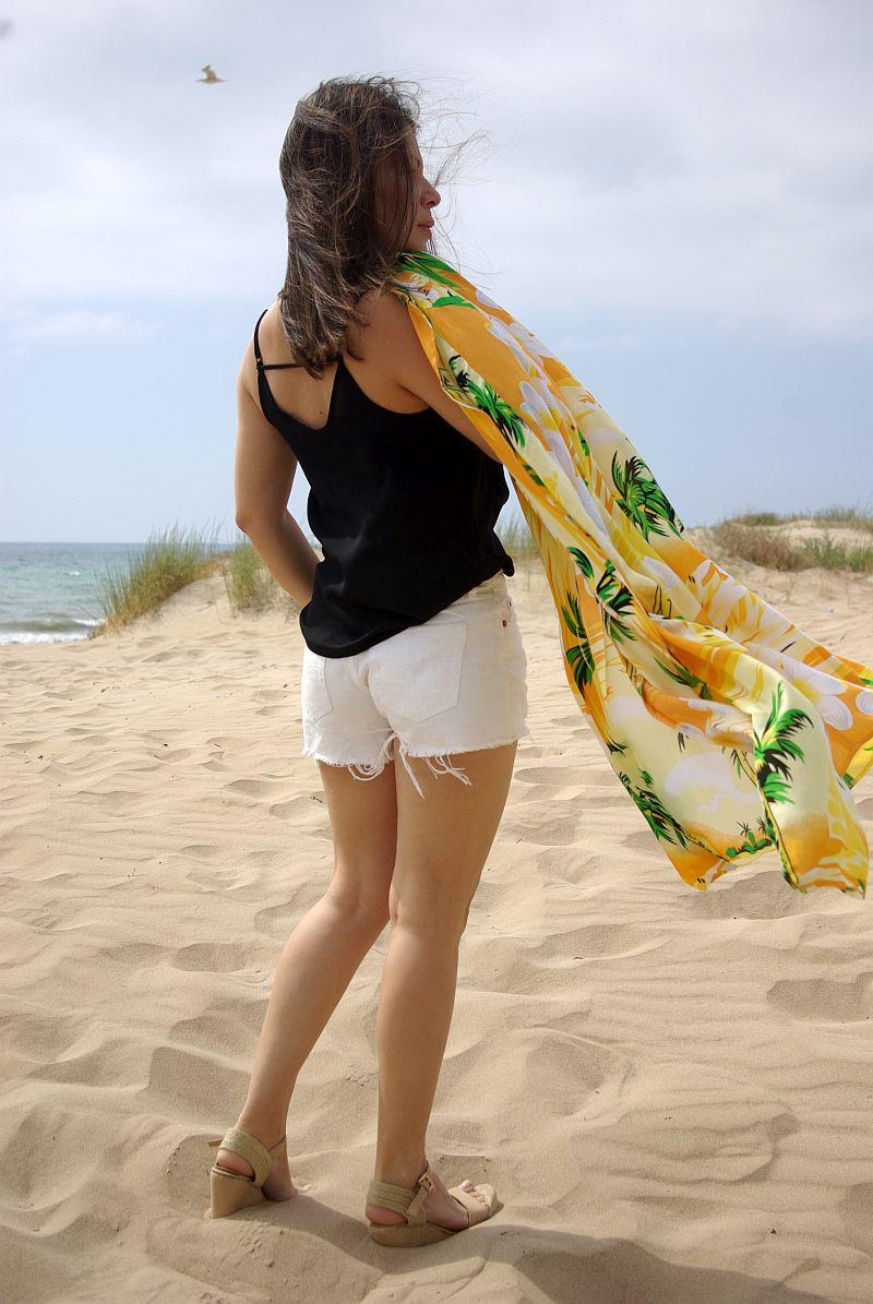 El look compuesto por un Kimono de color amarillo con flores blancas y palmeras verdes (típico estampado hawaiano), lo he combinado con una blusa básica negra, un short blanco y unas cuñas en color arena, he elegido estos colores neutrales para darle todo el protagonismo a este y no recargar el look con más color.