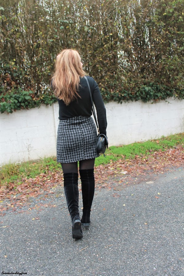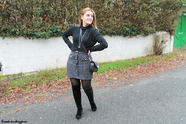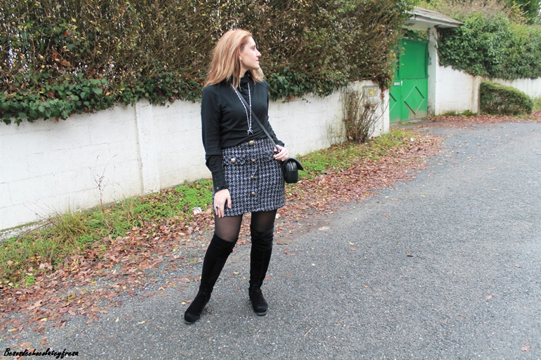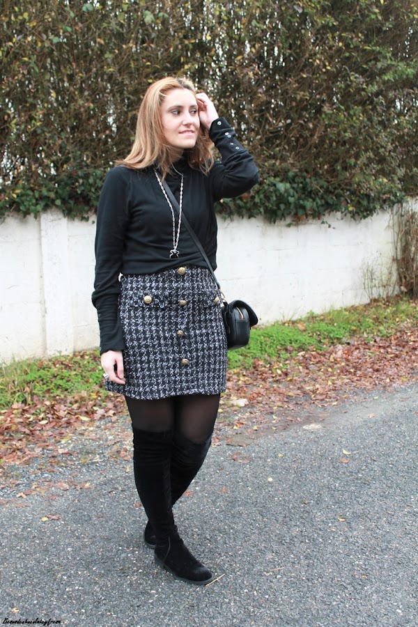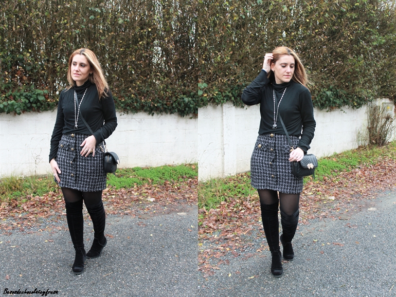 En el outfir de hoy llevo una falda de este tejido e inspiración en tono negros con botones simulados en dorado. La combine con sweater básico negro, junto a botas over the knee en terciopelo y bolso en el mismo color. Un look elegante, sobio y formal.
