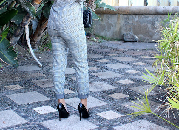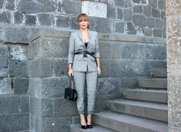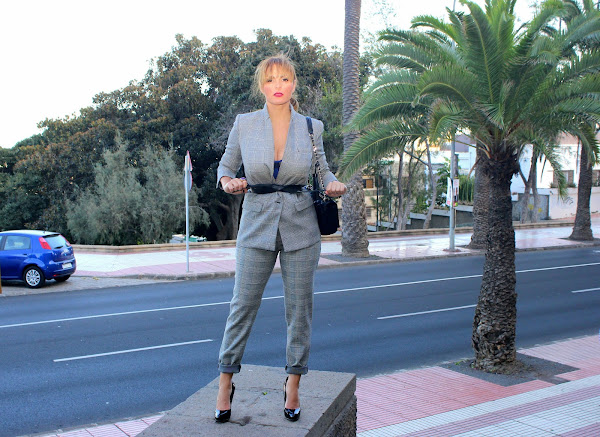 En mi caso me decidí por un escote bastante insinuante con un top de La Perla de encaje y transparencias que contrastaba con el estampado del traje príncipe de Gales. Ya saben que tengo la mano muy larga para los armario de mis chicos jajaja...y en esta ocasión la víctima fue mi marido, le cogí uno de sus cintos el cual me anudé a la cintura para ajustar la chaqueta.