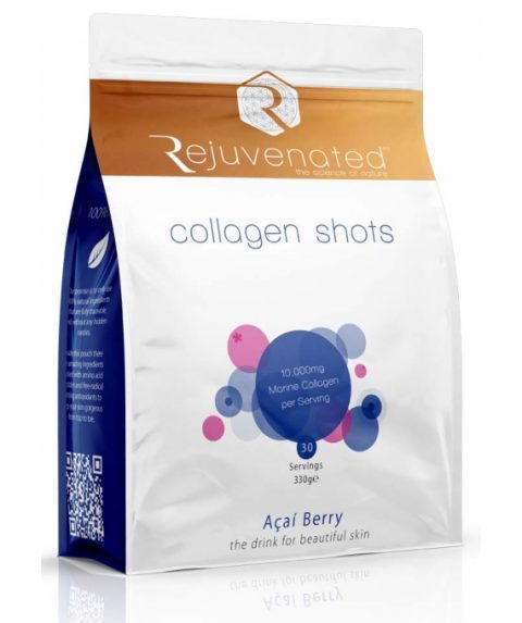 Collagen Shots de Rejuvenated. Este producto contiene 10 gr de colágeno marino de pescado blanco con polvo de acai por dosis. La baya de acai es un antioxidante natural muy potente que combina perfectamente con el colágeno para mejorar el estado de la piel por dentro. Las opiniones de este producto son muy buenas, pero también tiene un precio alto, aproximadamente 45€ el paquete para un mes. De venta en su web.