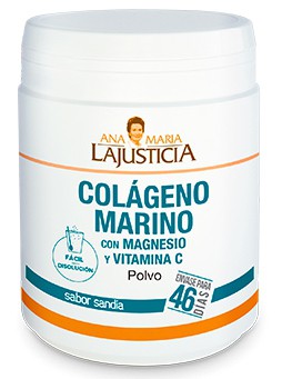 Colágeno Marino de Ana María Lajusticia. Envase para 46 días. Se toman 3 cucharadas al día, repartidas entre las comidas. Esta dosis diaria contiene 5,2 gr de colágeno, 227 mg de magnesio y 24 mg de vitamina C. De venta en Amazon, en este enlace por 13,99 €.