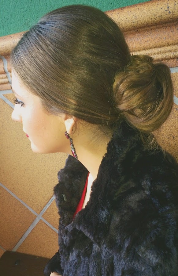 Quisimos hacerle un moño bajo y pasando desapercibido, ya que el mayor protagonismo se lo queriamos dar a los precioso pendientes y al mono en general.