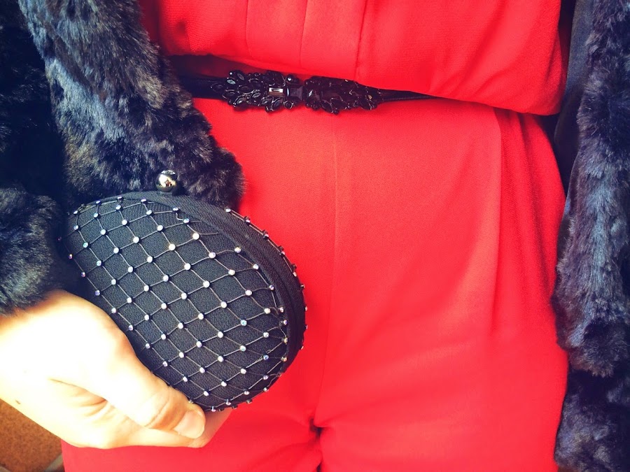 El mono es de Formul@, una de las marcas que la podéis encontrar en El Corte Ingles. Los zapatos y la chaqueta de pelo de color negro, junto con el bolso que lleva detalles en estrás.