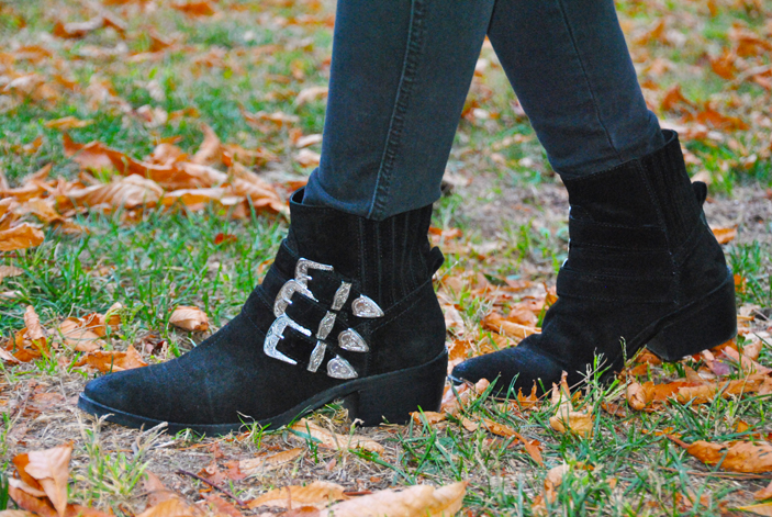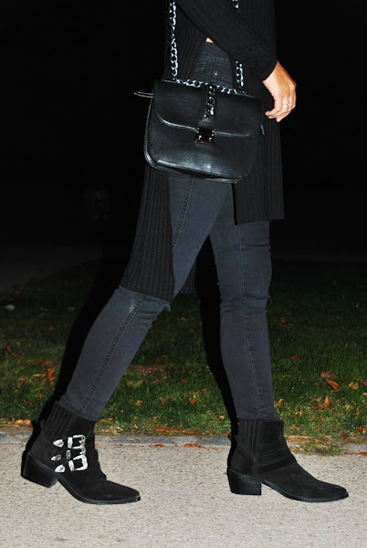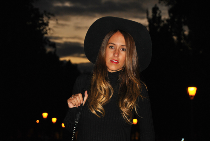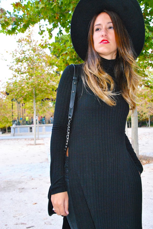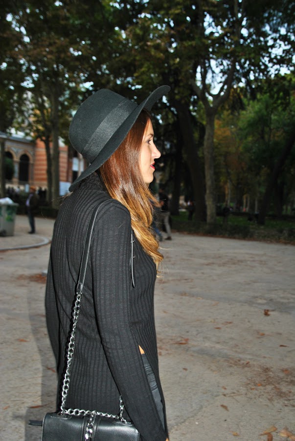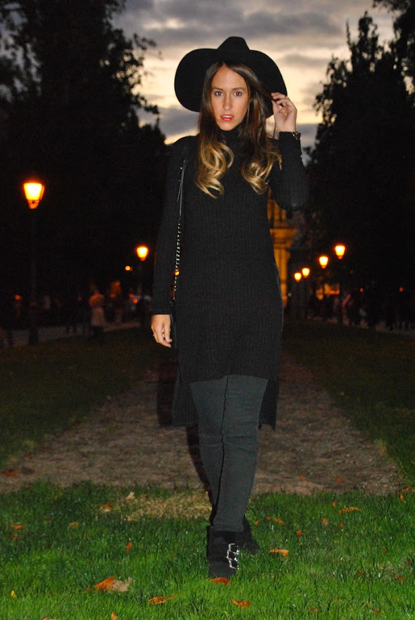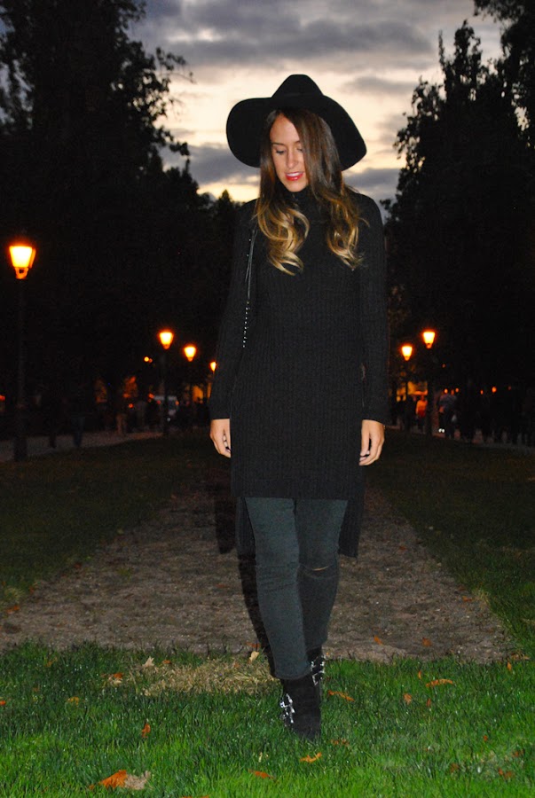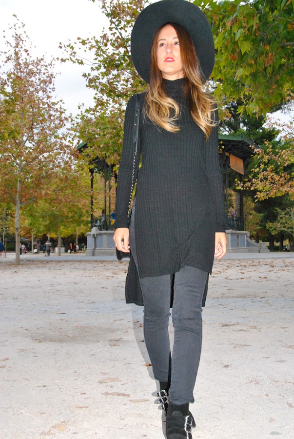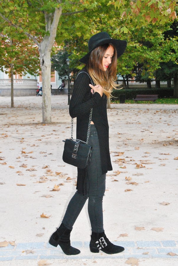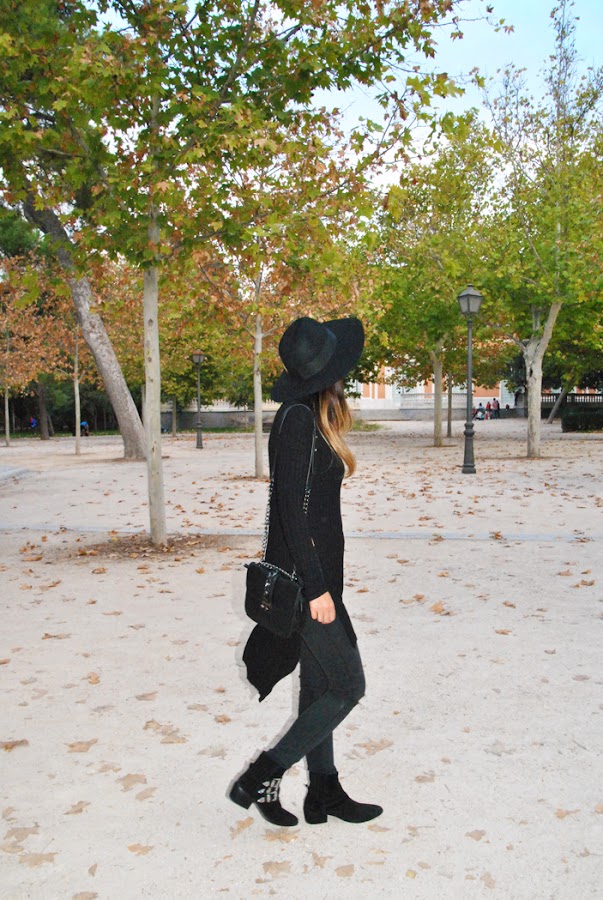 En el outfit combiné skinny jeans con rotos en la rodillas con un jersey de punto con cuello de cisne extralargo y con aperturas laterales hasta la cintura, no se lo puede pedir más rollo a una prenda... jajaja. Para complementarlos escogí mis botines preferidos de la temporada (de ante y hebillas plateadas), que aunque no los habíais visto todavía en el blog, son un imprescindible de mi día a día porque son súper prácticos y chic, ¡no digo más! Mi sombrero fedora de ala ancha y el bolsito de cadena ponen el punto y final a este total black look.