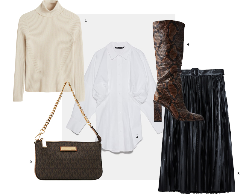 En orden numérico: Jersey canalé de cuello alto, Mango (19.99€) Camisa con pliegues, Zara (25.95€) Falda plisada, Zara (39.95€) Botas efecto pitón, Zara (39.99€) Bolso con logotipo, MICHAEL Michael Kors (94.95€)