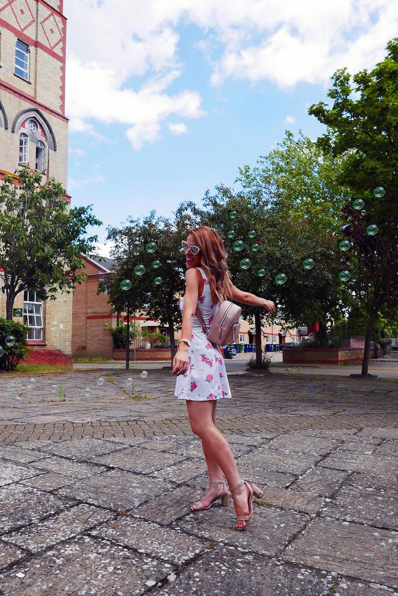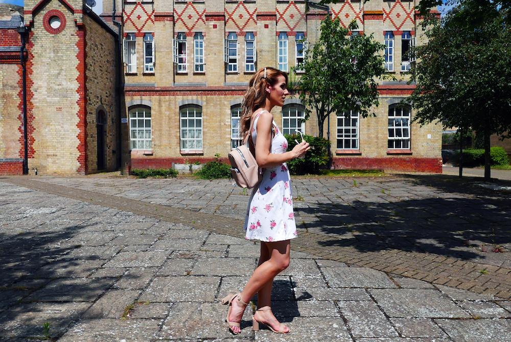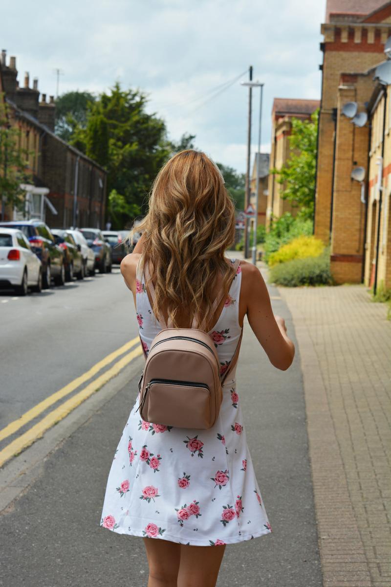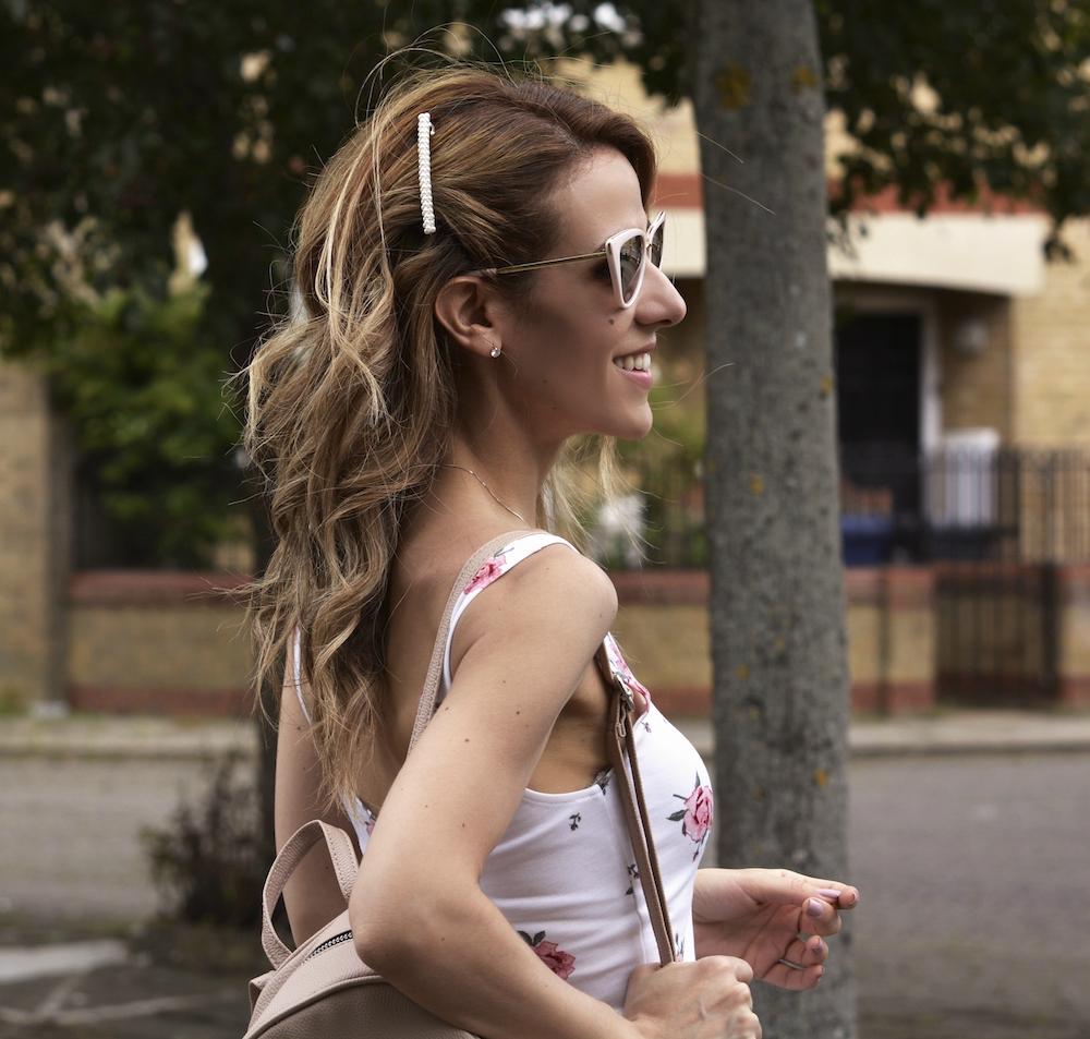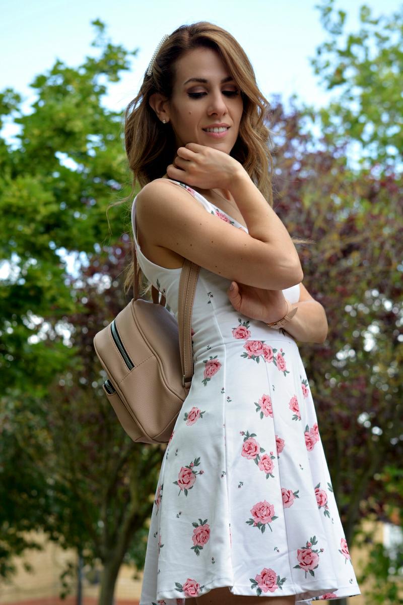 Como complementos llevo unas sandalias de Guess del verano pasado (este año han sacado otras similares), mochila nude, gafas rosas y accesorio para el pelo, todo de Primark y mi relojito de Cluse que me encanta.