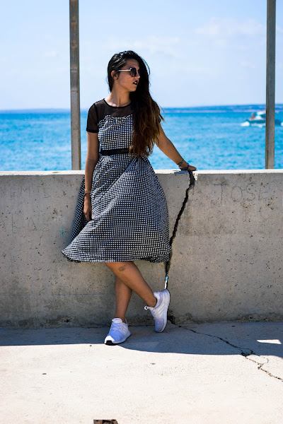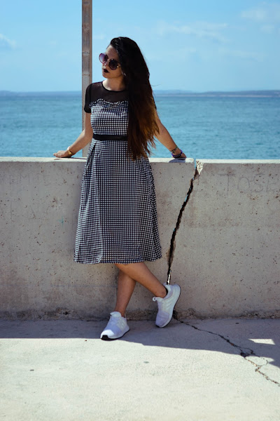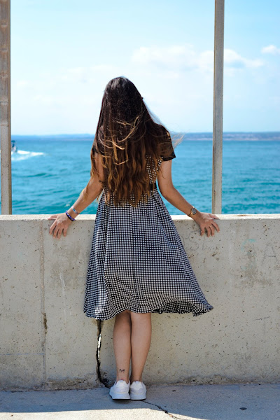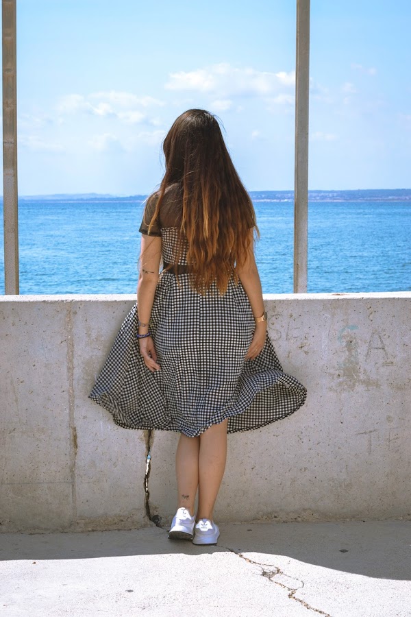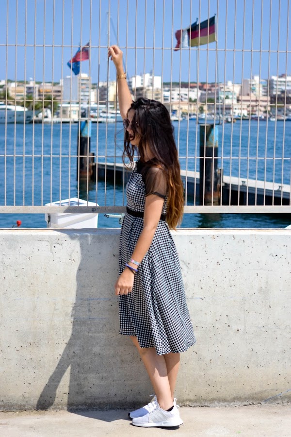 combina tendencias uniendo el estampado vichy que tanto furor está causando junto con algunas transparencias, que poco a poco van impregnando de nuevo las tiendas en su versión más sexy y femenina. Tiene un vuelo y una caída espectacular, y algo que nos favorece muchísimo a las que somos altas: el corte midi. Es mi vestido todo terreno. Con tacones, con sandalias, con botines, con sneakers -como es este caso- ¡lo que le pongas! va a quedar fabuloso.