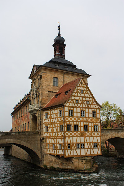A la entrada a lo que antiguamente era la ciudad propiamente dicha (Altstadt o ciudad antigua en alemán) encontramos la construcción más significativa de Bamberg: el antiguo Ayuntamiento o Altes Rathaus. Como podéis ver en la foto que abre este post, parece que el edificio estuviera flotando en medio del río. Se cuenta que el motivo de esto fue que el obispo de Bamberg se negó a conceder terreno para su construcción a los ciudadanos o que exigía un diezmo considerado por éstos excesivo. La respuesta de los ciudadanos fue la de construir una especie de isla artificial donde edificar su ayuntamiento, técnicamente fuera de la ciudad y donde se mantiene hasta nuestros días desde su construcción en el año 1387. Ingenioso modo de burlar la prohibición, ¿no os parece? Además, para todos los turistas que visitan la ciudad la imagen con la que iniciamos el post es la más característica de Bamberg. Aquí lo vemos desde otra perspectiva.