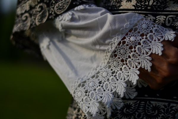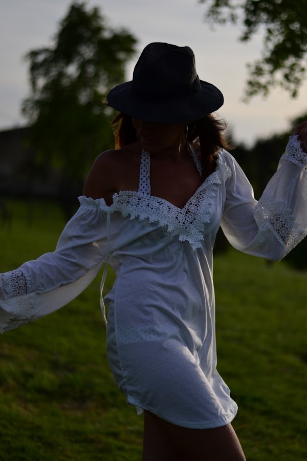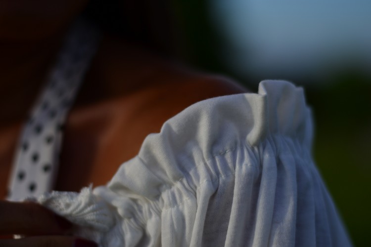 El vestido me parece muy cómodo para bajar a la playa, por ejemplo, por su corte holgado, tipo blusón. Me gusta mucho el detalle de la espalda descubierta y el bonito encaje en la parte baja de ésta, así como en mangas (acampanadas) y en escote, que puede anudarse al cuello, tipo halter, dejarse abierto o cerrar modo barco y mostrar los hombros al desnudo.