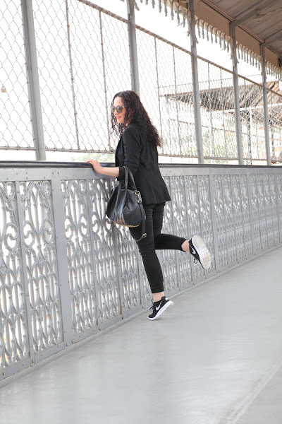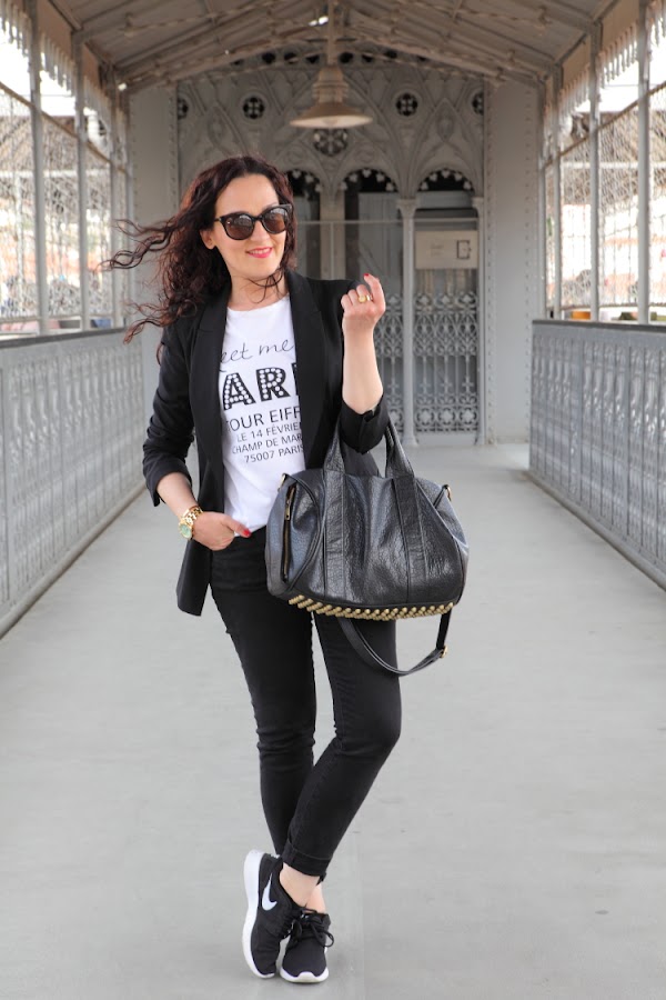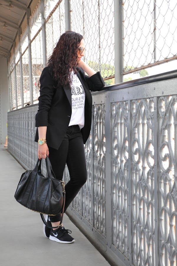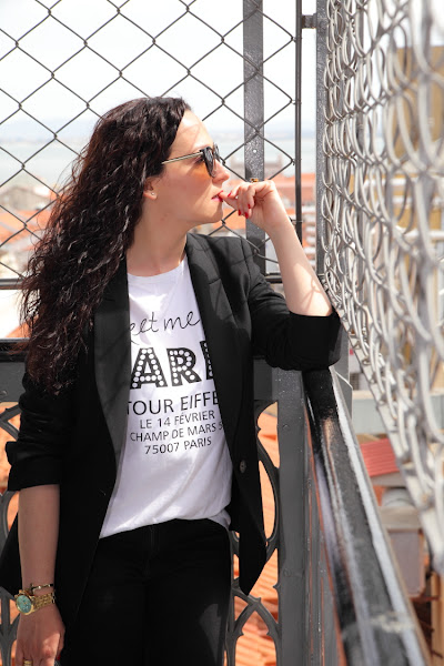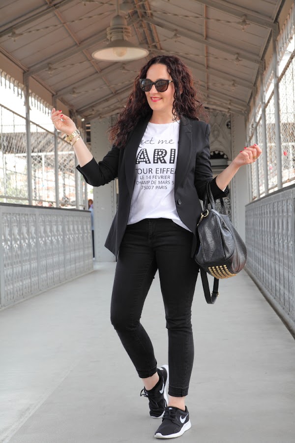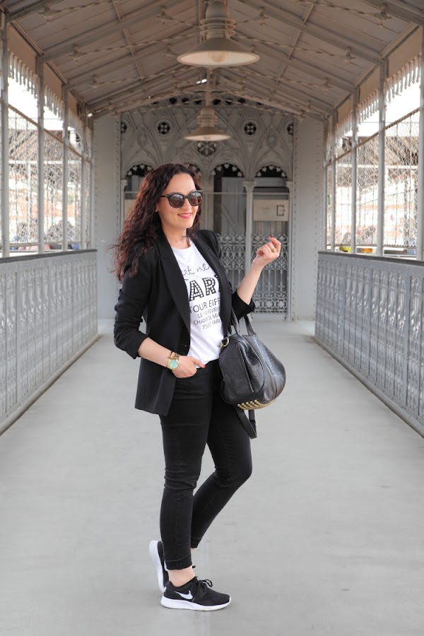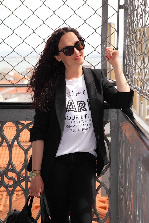 Las fotos están hechas en el Elevador de Santa Justa, un lugar muy bonito en el que puedes disfrutar de unas increíbles vistas de la ciudad de Lisboa. En él llevo un outfit cómodo para hacer turismo pero que perfectamente podemos llevar en nuestro día a día. Vuelvo a utilizar mi querido negro, que esta vez combiné con blanco en un look con blazer, camiseta y jeans. En los pies mis queridas Nike Kaishi Run, las zapatillas para andar más cómodas que he tenido en toda mi vida. Creo que alguna vez ya os lo he dicho, pero después de utilizar Adidas, Munich, New Balance, Converse..., en comodidad estas Nike ganan y con diferencia.