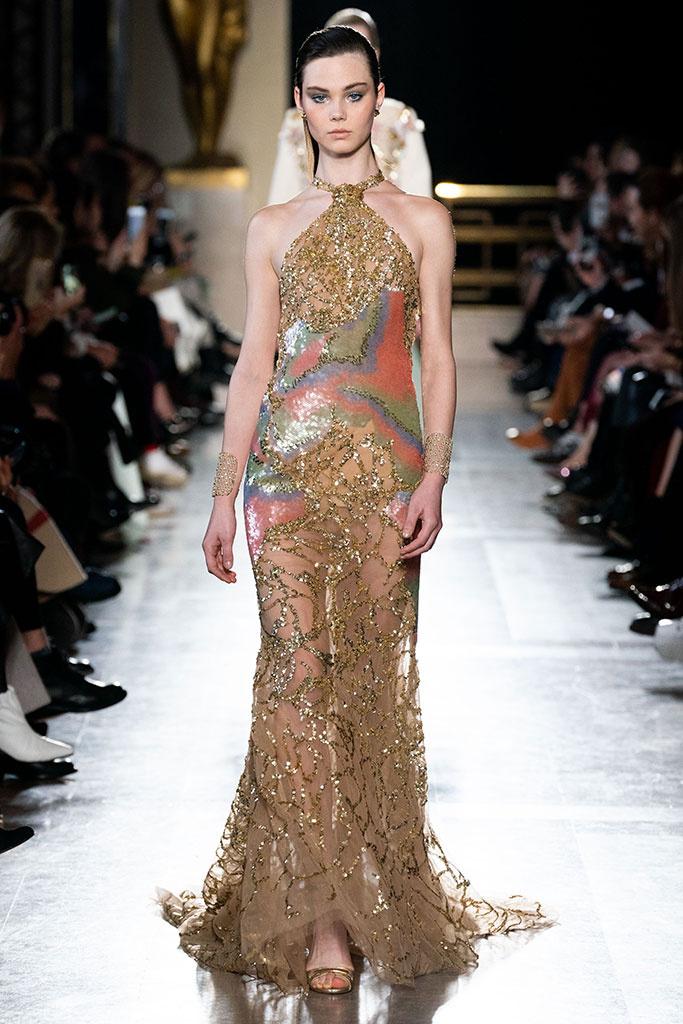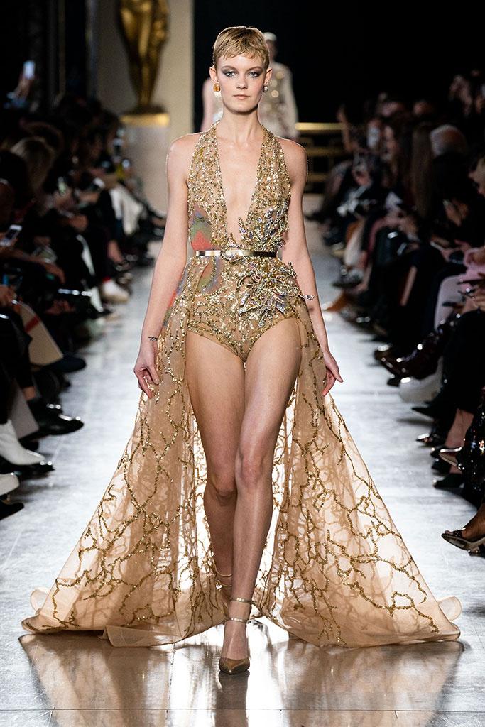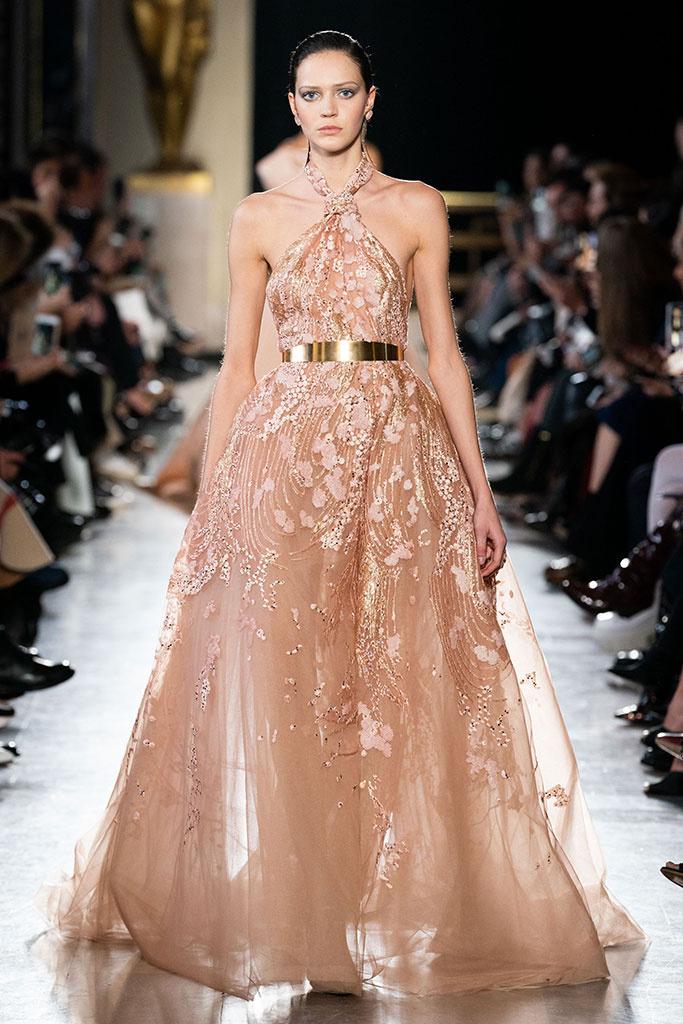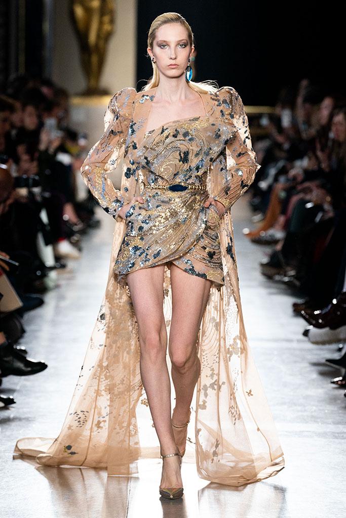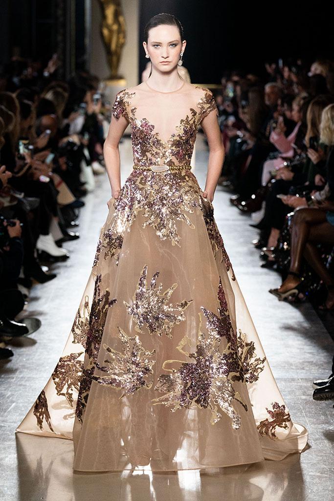 Pedrería, tul y transparencias fueron las notas características del desfile. Un desfile en el que no faltaron tonos metalizados y por supuesto tampoco los brillos ni las lentejuelas.