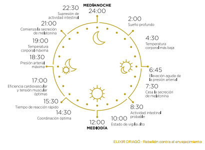 ELIXIR DRAGÓ ha sido diseñado, además, en función de los modernos hallazgos de la Cronobiología, que considera la toma de los ocho nutracéuticos en base a los ritmos biológicos orgánicos que siguen ciclos de 24 horas generados por el reloj biológico. A comienzos de siglo, Smolensky y Lambert resumieron la sucesión a lo largo de las 24 horas del día, de los máximos y mínimos de algunas variables que muestran ritmos circadianos en los seres humanos.