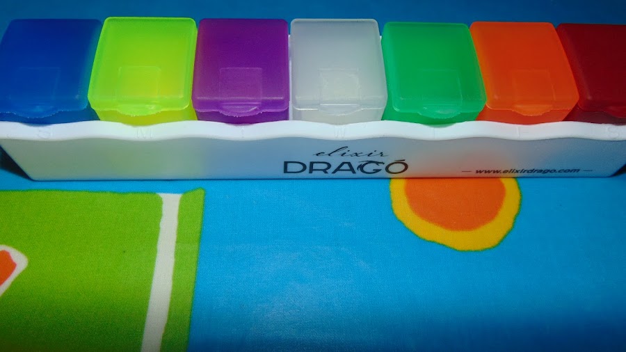 Y el tratamiento viene con este pastillero con una cajita por cada día de la semana de Domingo a Sábado (con los nombres de los días de la semana en inglés) para poner las pastillas de cada día en su día correspondiente. Aunque yo me lo organicé diferente como hay 7 colores y 8 pastillas pongo cada una en su color menos la dorada la de omega 3 que la pongo con la verde que son las dos las que debemos tomar en la comida, ya que son muchas pastillas y a mí me sirve para organizarme mejor.