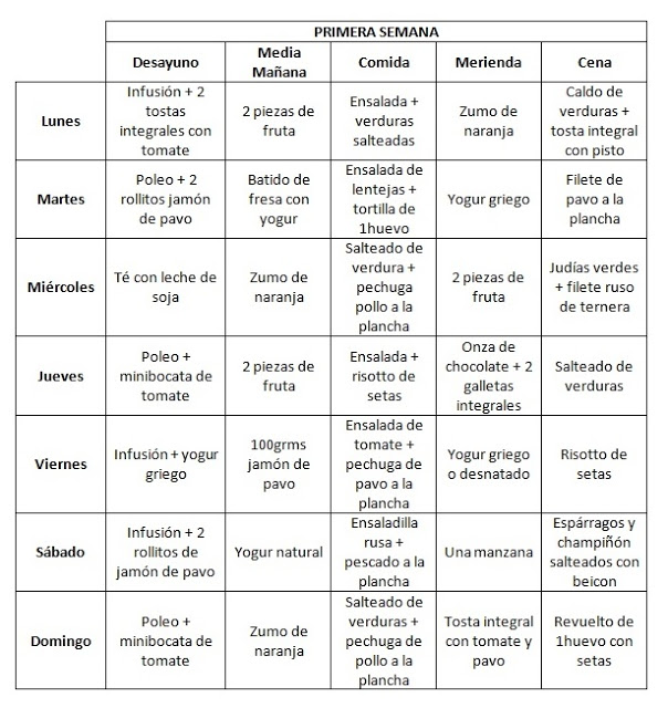 Ahora hace cuatro semanas de dieta, nos enseña su menú para todo este tiempo. Desde luego no es repetitivo. Aconseja hacer dieta y ejercicio también, cosa muy necesaria para quemar las grasas más rápido.