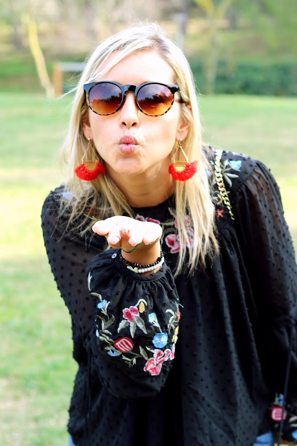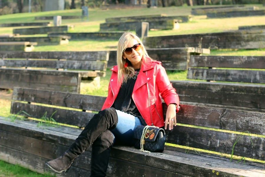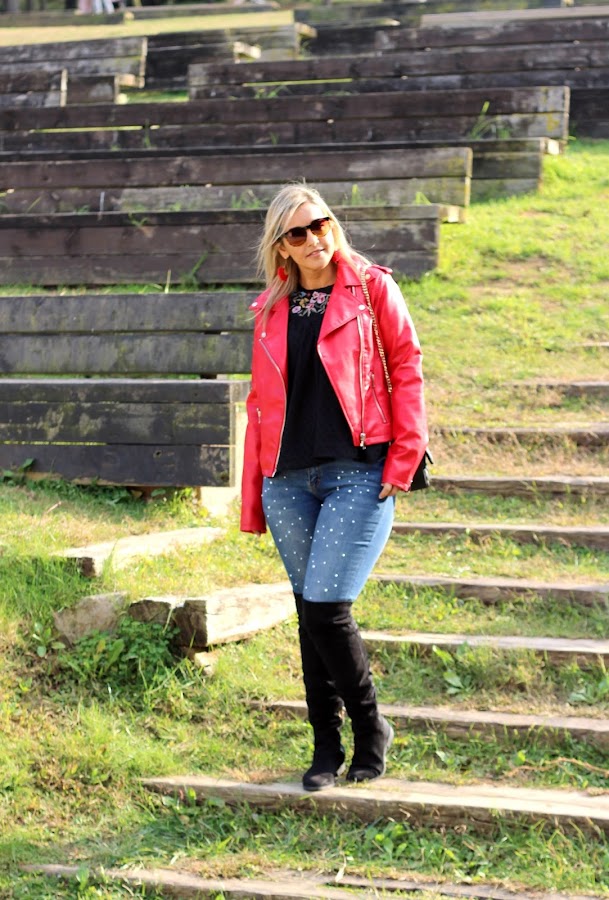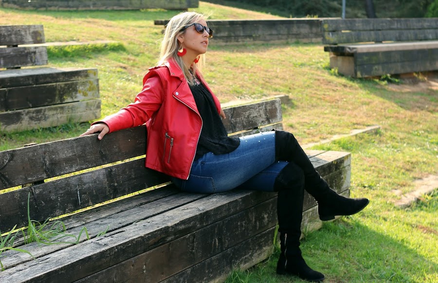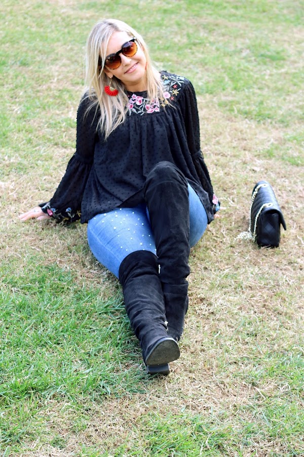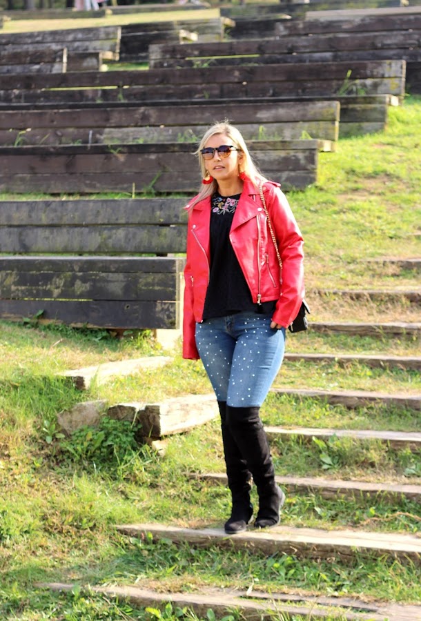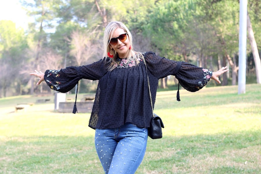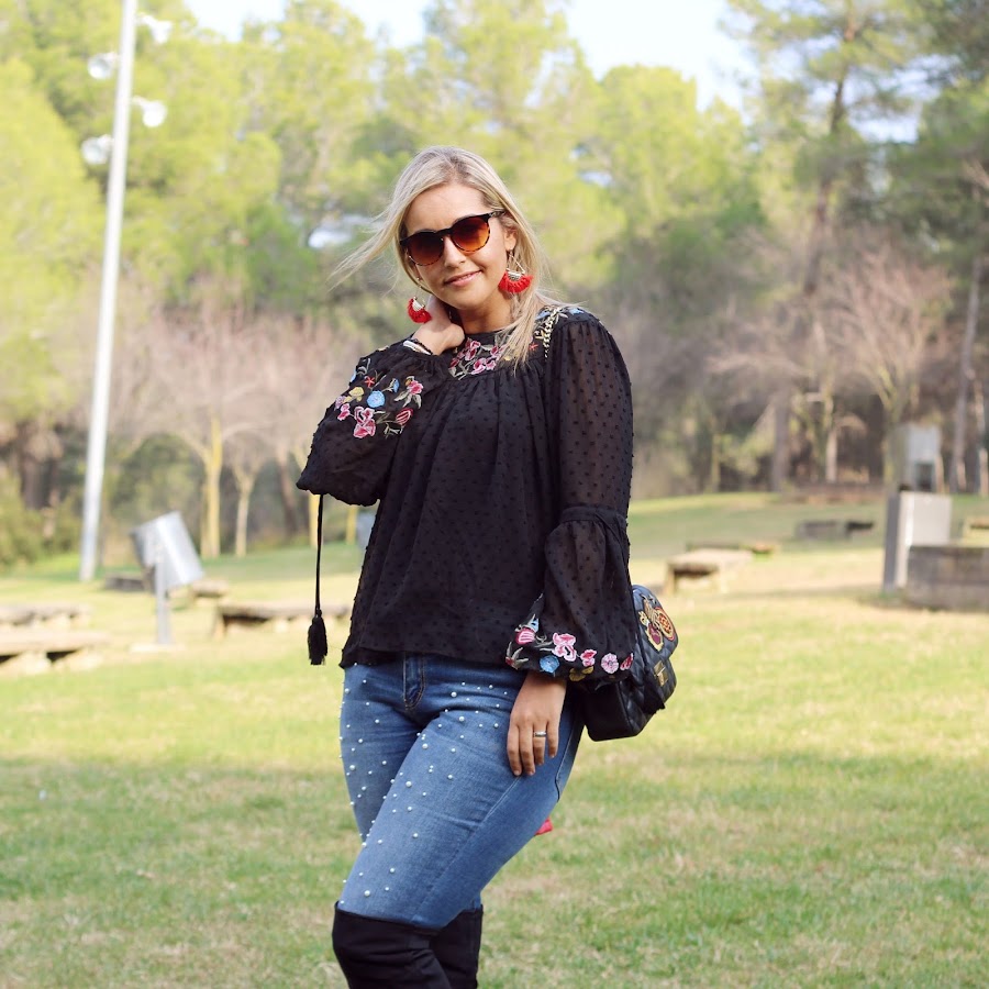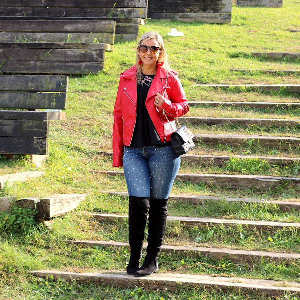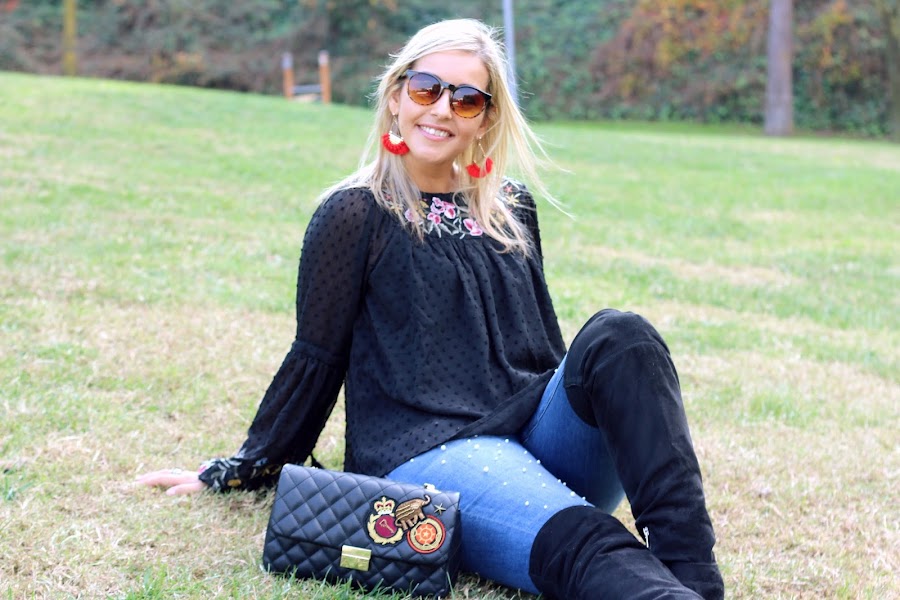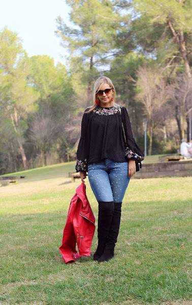 Hoy os traigo un look casual chic. En el look de hoy, llevo mi nueva blusita negra de plumeti y con bordados de Zaful, que me encantó en cuanto la vi. La combiné con mis jeans de perlas, que son super tendencia esta temporada y una biker roja. El resto de accesorios, fueron mis botas negras por encima de la rodilla y mi bolso negro con parches. Un look sencillo y cómodo perfecto para llevar el fin de semana.