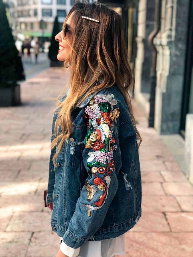 Hoy os muestro un look que se sale bastante de mi estilo, las cazadoras vaqueras nunca me han entusiasmado ¡pero ! todo lo que es lentejuelas, abalorios, brilli brilli... me fascina. Así que nada más ver esta chaqueta supe que la necesitaba en mi vida.