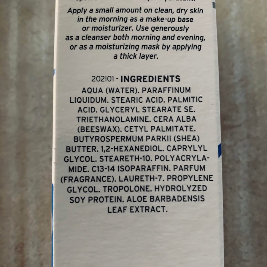 Aqua. Paraffinum Liquidum. Stearic Acid. Glyceryl Stearate. Triethanolamine. Cera Alba. Cetyl Palmitate. Butyrospermum Parkii. Steareth-10. Polyacrylamide C13-14 Isoparaffin. Laureth-7. Propylene Glycol. Hydrolyzed Soy Protein. Aloe Barbadensis. 1,2-Hexanediol. Caprylyl Glycol. Tropolone. Parfum.