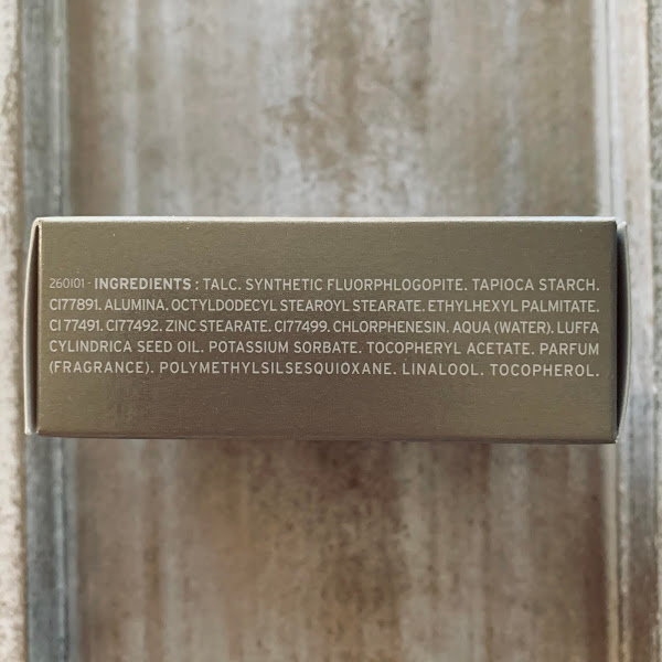 Talc. synthetic fluorphlogopite. tapioca starch. ci77891. alumina. octyldodecyl stearoyl stearate. ethylhexyl palmitate. ci 77491. ci77492. zinc stearate. ci77499. chlorphenesin. aqua (water). luffa cylindrica seed oil. potassium sorbate. tocopheryl acetate. parfum (fragrance). polymethylsilsesquioxane. linalool. tocopherol.