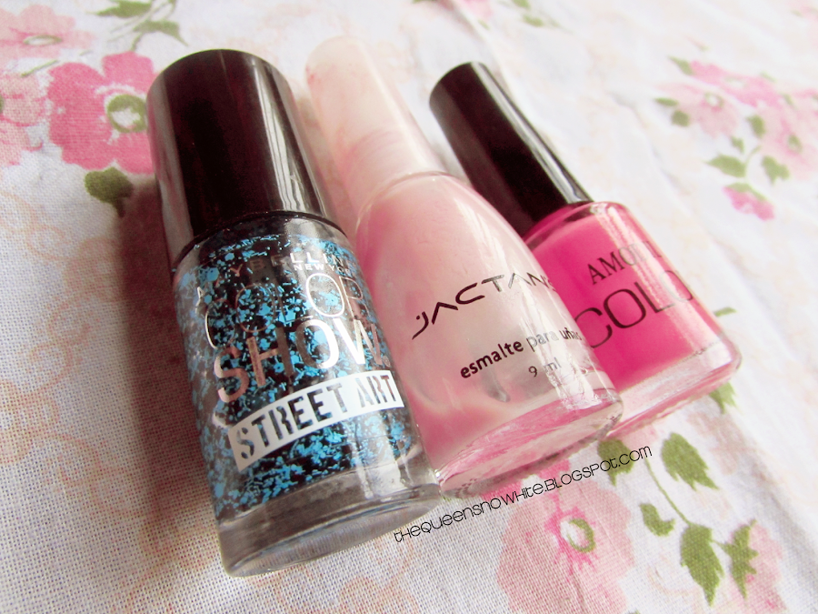 Por último, estos son los esmaltes que me han dejado (?). El "Blue Beats" de Maybelline Color show Street Art; "Vía lactea" de Jactans; y "Más que amigos" de Amodil Color.