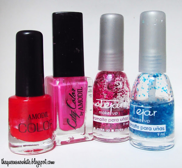 Comenzando con los esmaltes, tengo rojo miu miu y One Way de Amodil y dos de Tejar. Estos últimos no son empties, pero están sequísimos y los tuve que tirar jajaja. También desconozco su nombre, así que si alguien los sabe, que los deje en los comentarios .