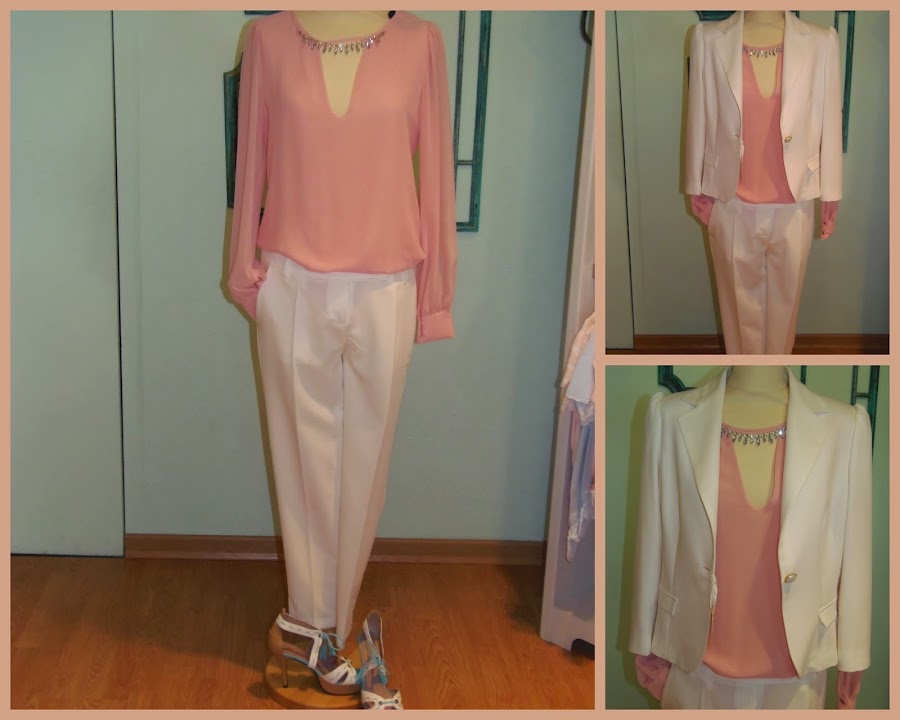 Para las que nos les guste llevar falda o vestido, también tenemos unos outfit perfectos, creados con un pantalón de traje en color blanco y blazer a conjunto. Este traje lo hemos combinado con camisa en rosa y azul. Un look más informal creado con camiseta y combinado con blazer o abriguito de primavera en color rosa ¿Con cuál te quedas?