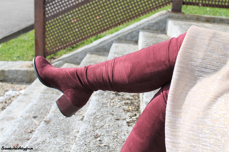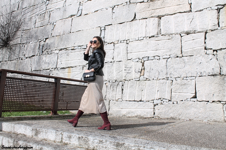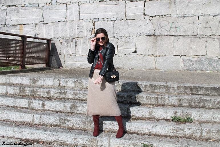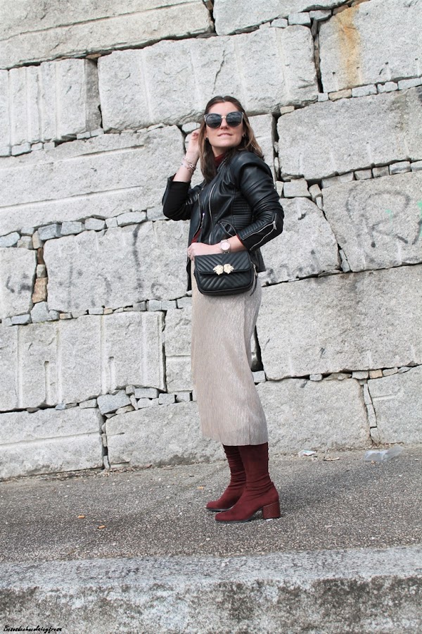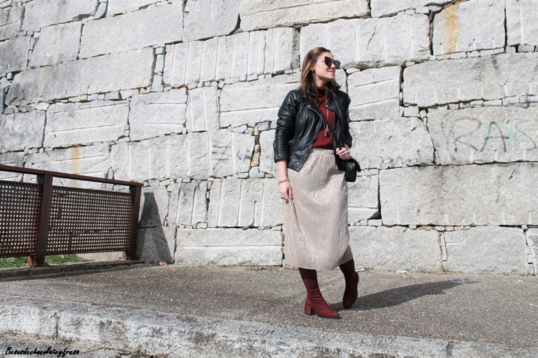Para el look de hoy aposté por tonos burdeos para combinar la falda midi en dorado, pues los brillos y este color tan destacado no solo es apto para la noche. Sweater de cuello cisne y canalé metida por dentro de la falda a juego con botas XXL de antelina. Como complementos y abrigo aposté por tonos negros como el collar, bolso, gafas de sol y la biker de cuero.