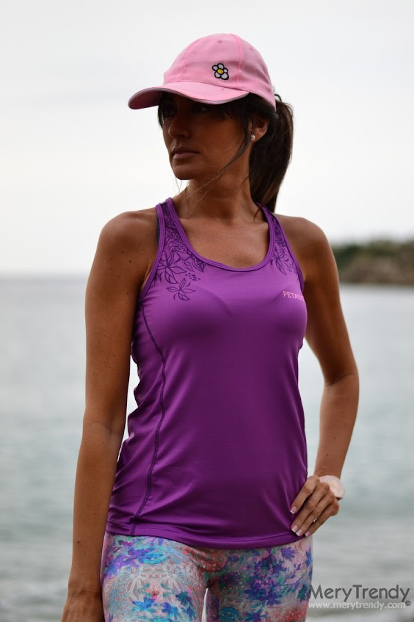 Es un conjunto formado, de un lado, por una camiseta de tirantes de espalda de nadadora de la marca española (y además asturiana) Petalys, que precisamente os enseñaba a finales de mayo, pero en color azul, aquí. Una prenda técnica para running, muy fresquita, que me permite disfrutar más de mis entrenamientos gracias a su tejido ligero mezcla de Coolmax y Lycra y sus costuras mínimas, que me evitan incómodas y molestas rozaduras. Por otra parte, dispone de filtro UV para protegerme de los efectos solares más nocivos. Además, y gracias a su corte semi-entallado, se adapta a mi figura cómodamente y de manera natural, permitiéndome a la vez total libertad de movimientos. Por si esto fuera poco, con la técnica de sublimación de su estampado, me he asegurado una conservación óptima de todas sus propiedades por mucho tiempo: transpirabilidad, suavidad y color invariable.