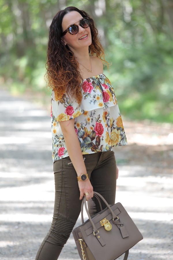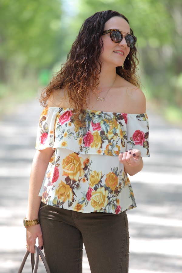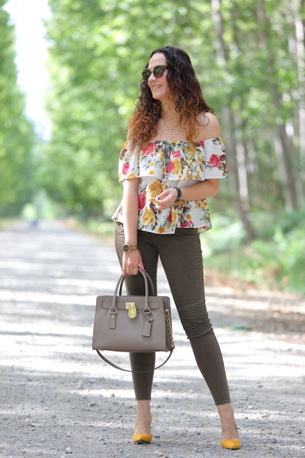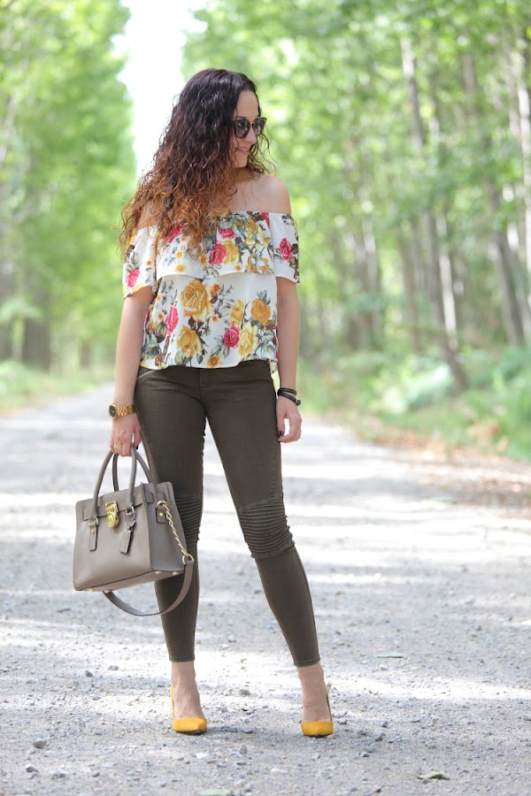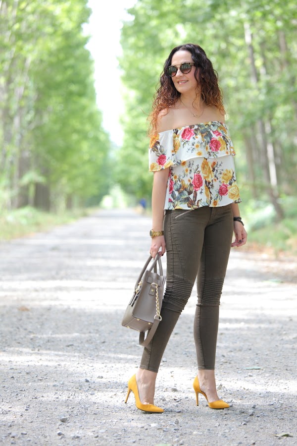 Preparando los posts de esta semana me di cuenta que tenía estas fotos de finales de septiembre pendientes de compartir con vosotros. Así que aprovechando que estos días el tiempo todavía nos está dando una tregua aprovecho para que las veáis. Un outfit sencillo en el que he hecho un combo con un top escote Bardot, que tanto me gusta, y pitillos caqui. El toque lo doy con los salones mostaza que compré el año pasado y que ya tenía ganas de volver a utilizar.