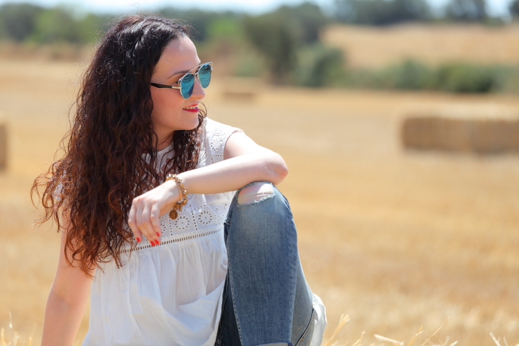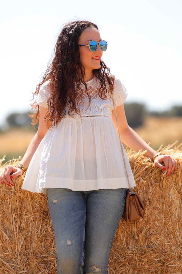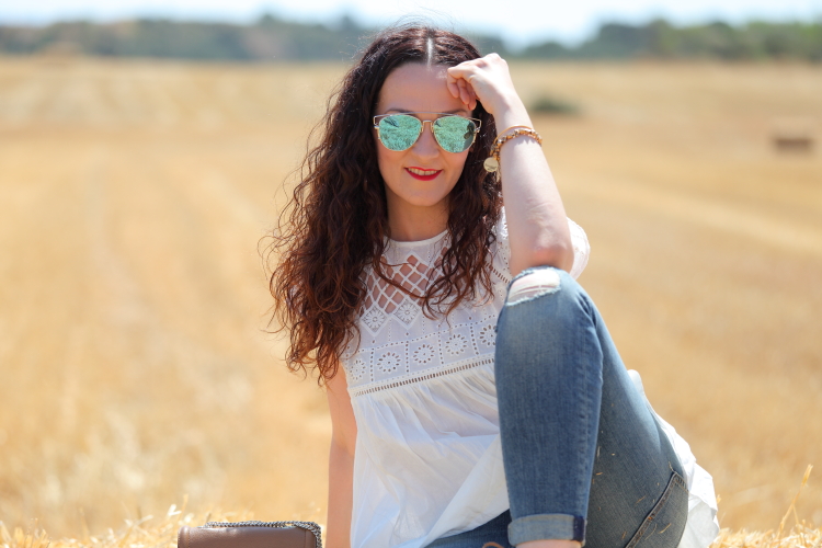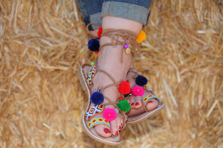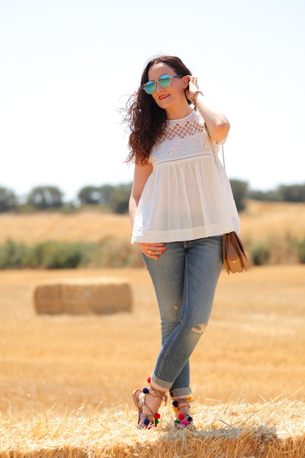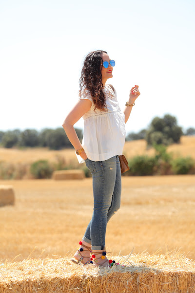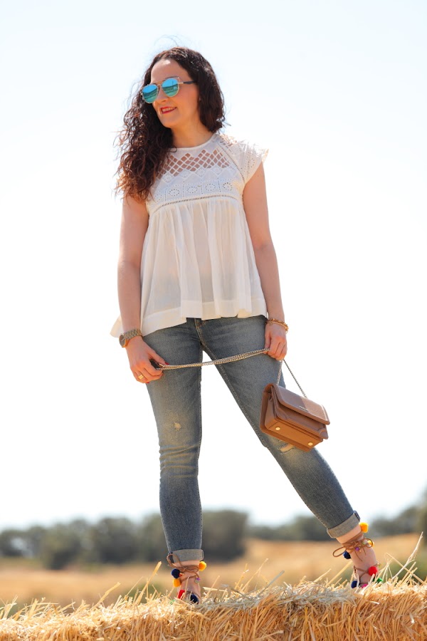 Hace unos días uno de nuestros amigos corrió una trail cerca de donde vivimos y para allí que nos fuimos a dar ánimos. Elegí este look con blusa bordada y mis nuevos jeans porque tenía claro que quería un look relajado para disfrutar del día. El toque de color lo di con mis sandalias de pompones, que además de bonitas son lo mejor para ir cómoda.