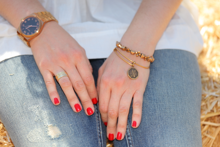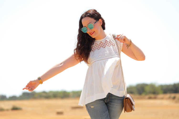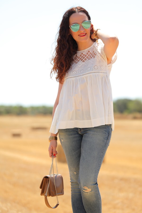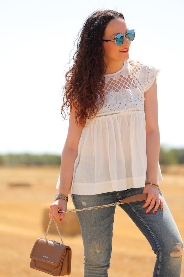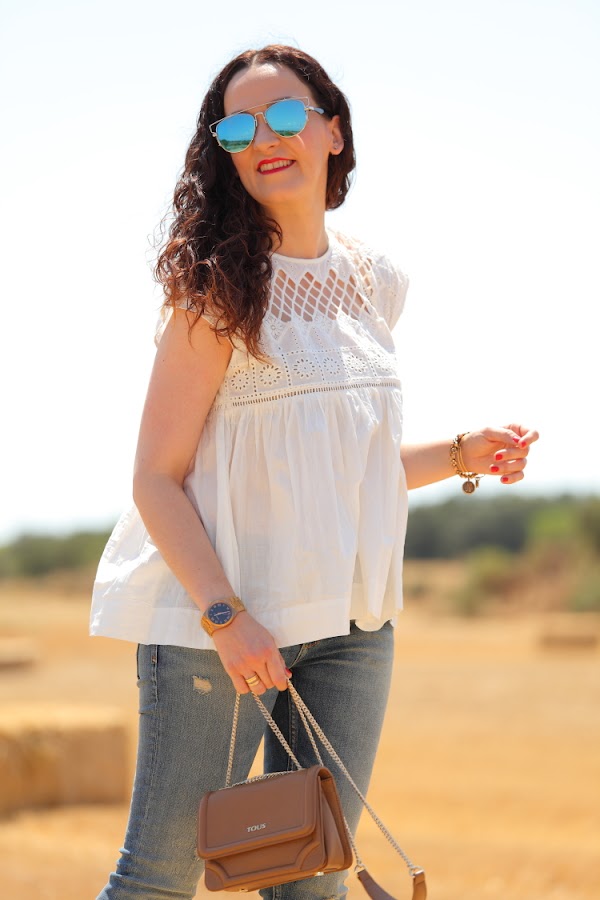 Blusa/Blouse: Zara. Jeans: Zara. Pulseras/Bracelets: Alex&Ani vía Ramiro Joyeros. Reloj/Watch: Michael Kors vía Ramiro Joyeros. Bolso/Bag: Tous.