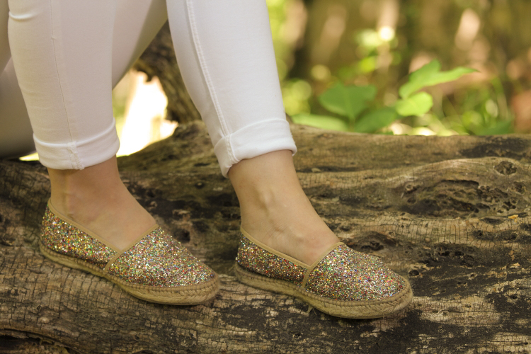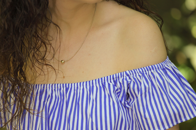 En cuanto al look, el viernes me llegó a casa este precioso top de rayas con escote Bardot que me moría de ganas por estrenarlo. Como quería ir muy cómoda me fue genial, así que me lo puse con unos jeans blancos, mis esparteñas de purpurina y uno de mis bolsos preferidos para el verano.