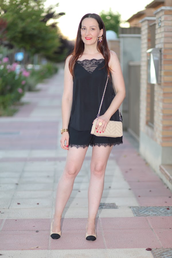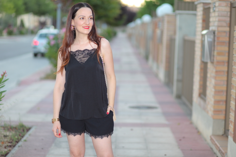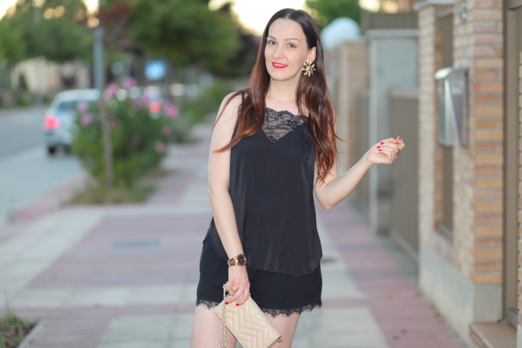 A estas alturas del blog no hace falta que os explique mi pasión por el color negro. De sobras ya sabéis que me encanta y que looks como el de hoy son de mis preferidos. Esta vez llevo un outfit de estilo lencero con top y shorts que combinan tela y encaje. El color lo añadí con el bolso y los zapatos en nude, que siempre hace buen combo con el negro.