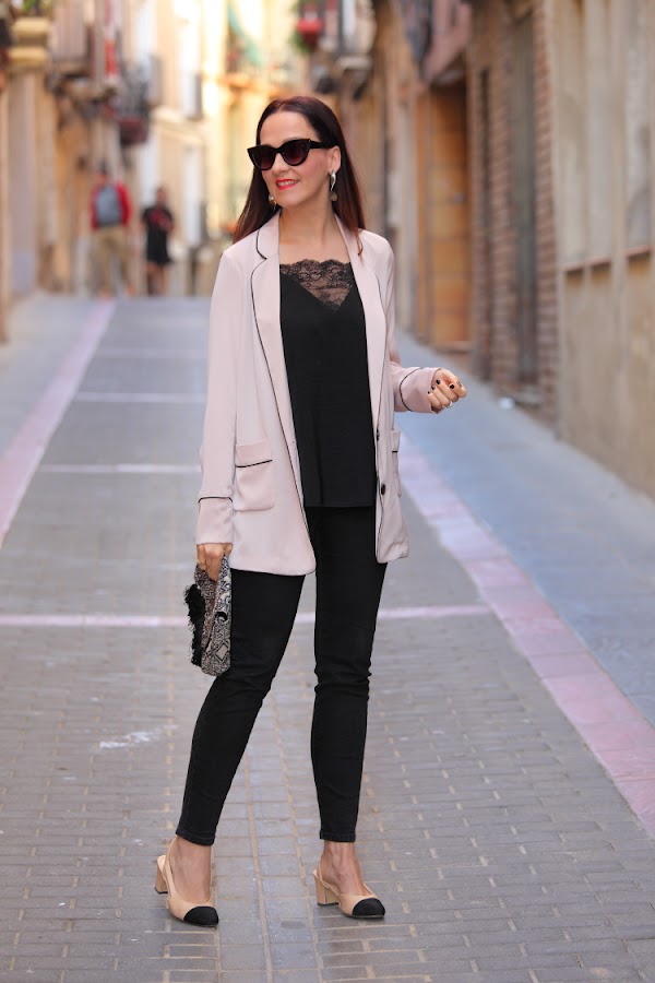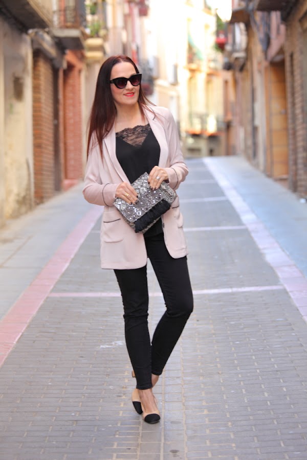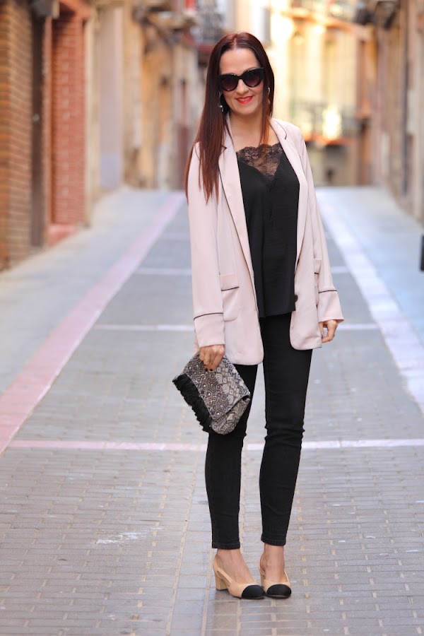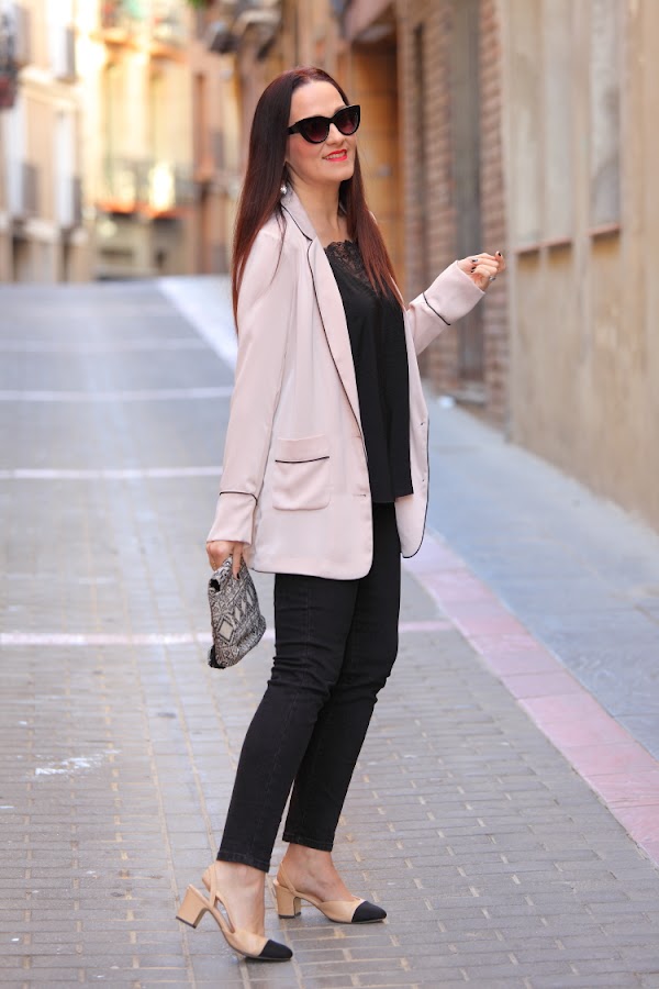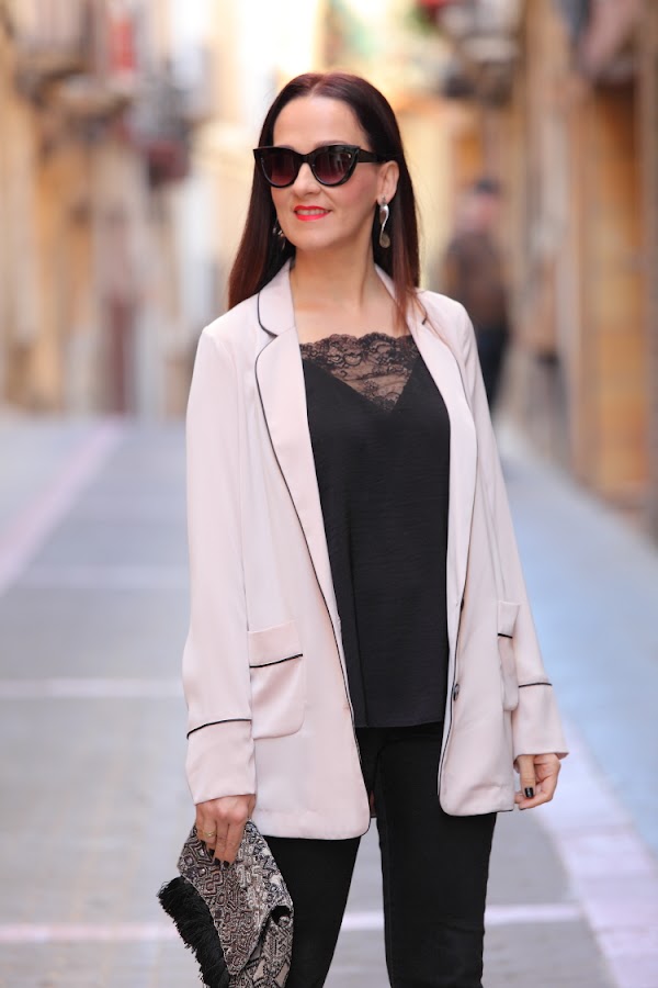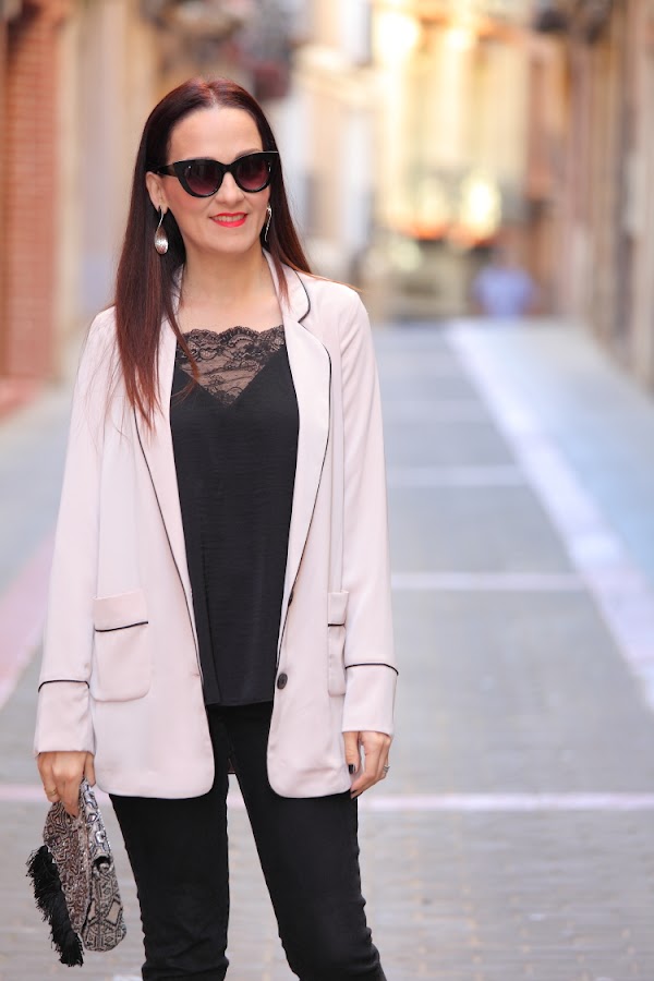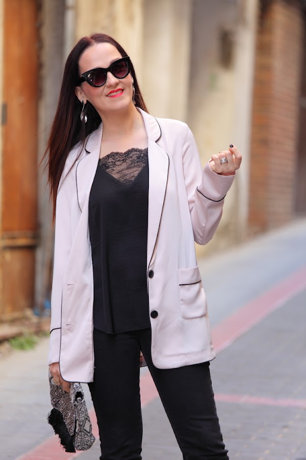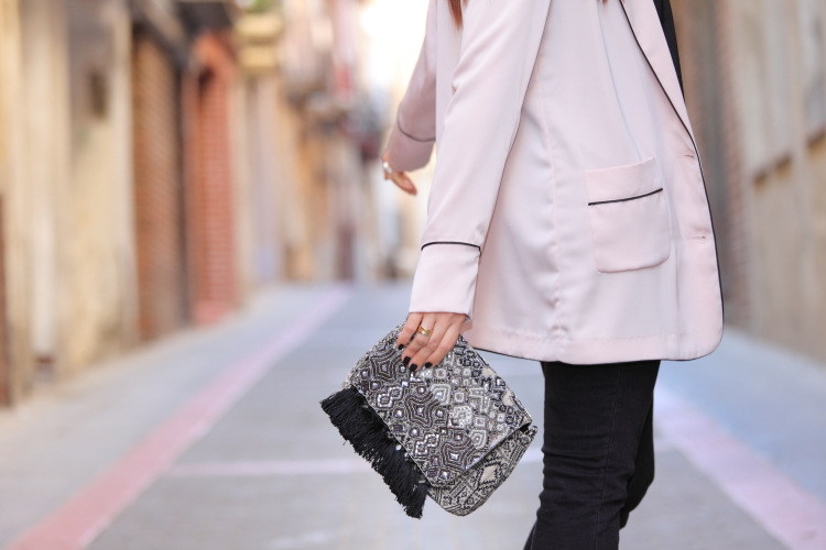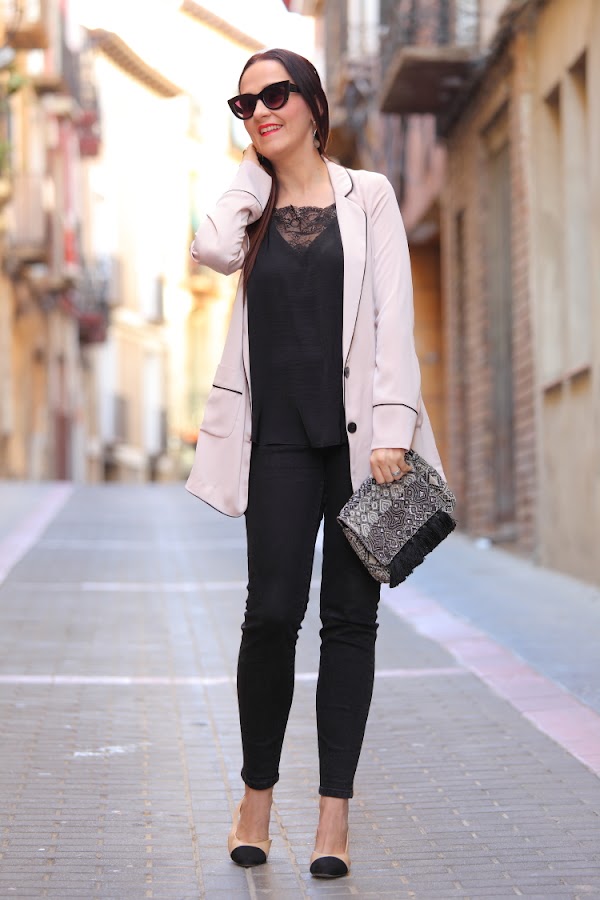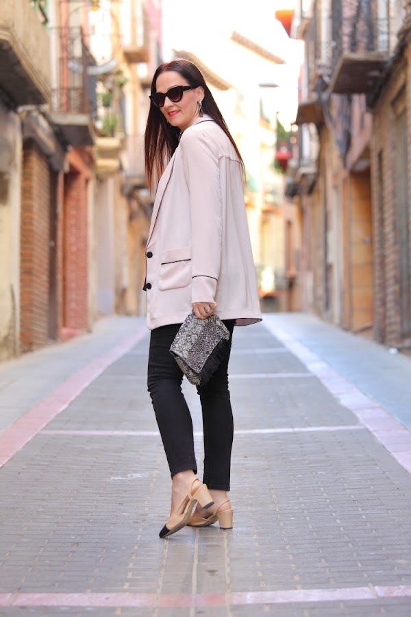 Si hace unos años me hubieran dicho que yo iba a salir en pijama a la calle les habría dicho que si estaban locos. Pues bien, mirarme ahora, aquí estoy con mi chaqueta de estilo pijamero más feliz que una perdiz. Y que mejor que llevarla con un total look negro para dejarle todo el protagonismo. Además para cerrar este look llevo un bolso joya precioso que compré a principio de la temporada y que estaba esperando su momento para ser estrenado.