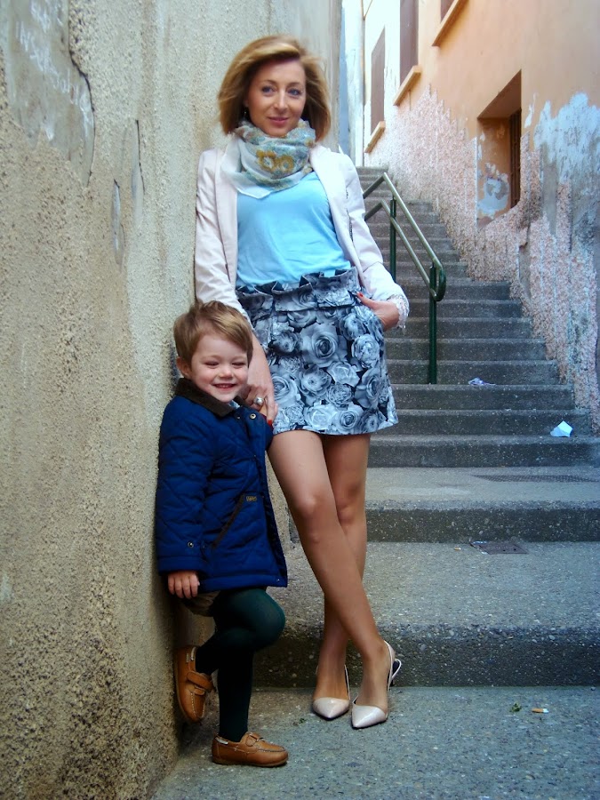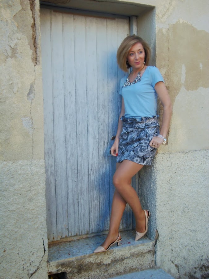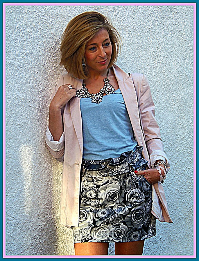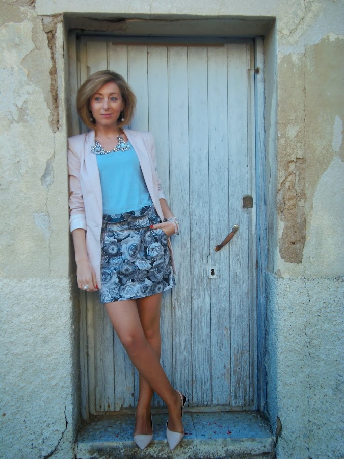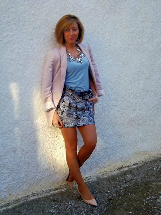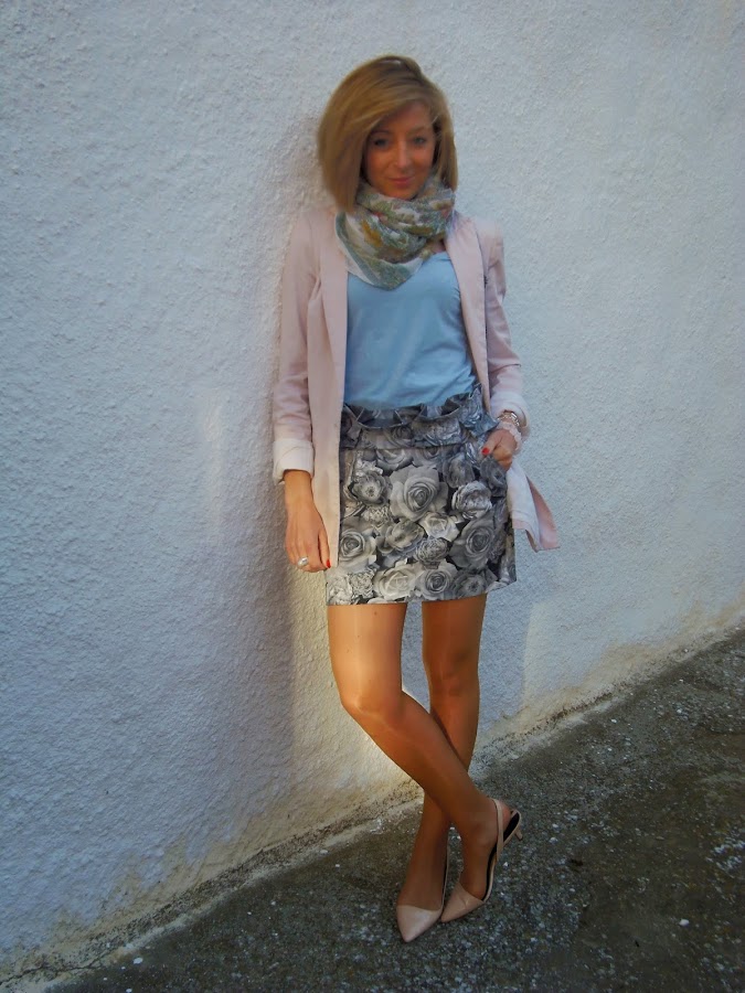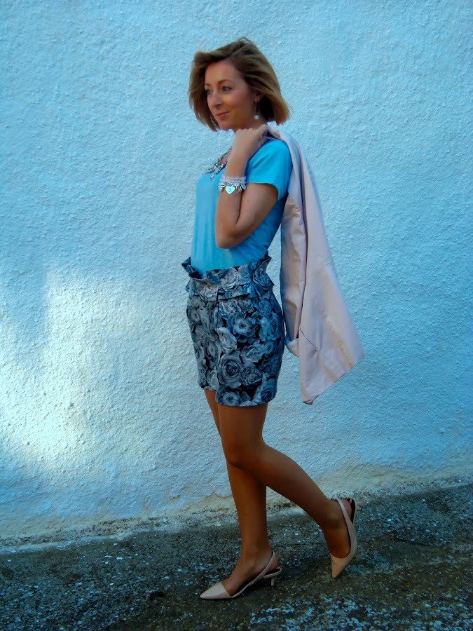Este look lo utilice el sábado para dar un paseo, algunas lo pedisteis ver por instagram. La prenda protagonista del look es la falda. Me encantan este tipo de faldas de cintura alta, sientan muy bien, además el estampado es monísimo y muy fácil de combinar. Esta vez la he combinado con dos de los colores de moda esta temporada rosa y azul bebe. Creo que el resultado quedo perfecto.