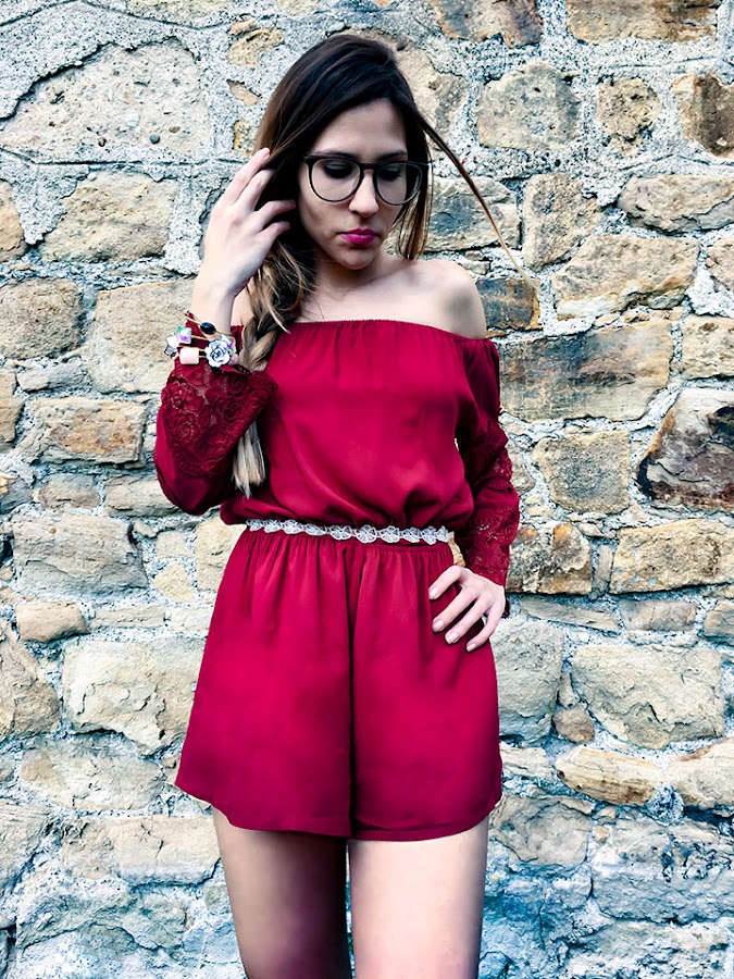 Me encanta todo de este mono que os enseño hoy! Y es que el estilo boho me chifla y si tiene toques románticos más aún! De color burdeos, con hombros descubiertos y un detalle de encaje en las mangas... No se puede pedir más!