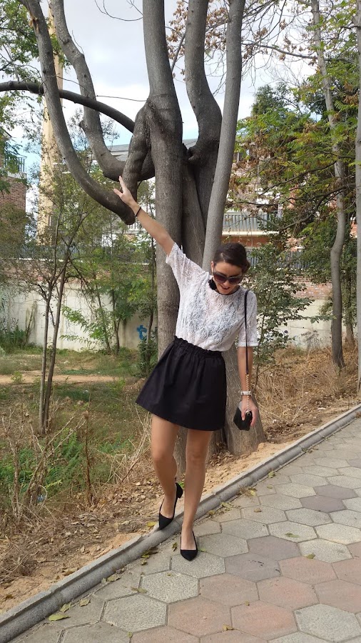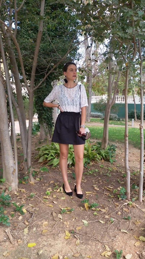 Elegí esta falda de raso con volantes en la cintura en color negro y la combiné con esa camiseta de encaje en color blanco para darle el toque chic al look.