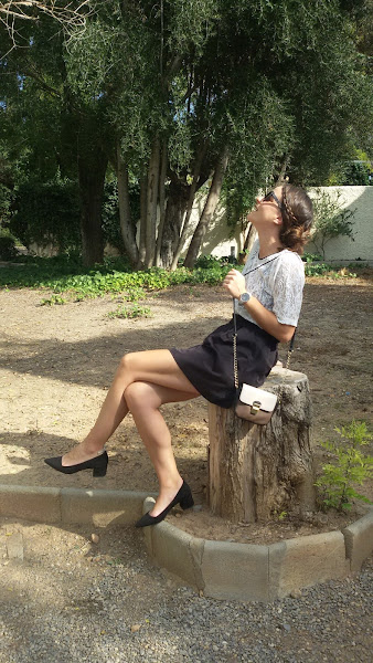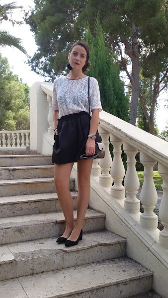 Como calzado me puse estos zapatos de tacón bajo de ante en color negro y como complemento, bolso pequeño en tonos marrones , negros y crudos.