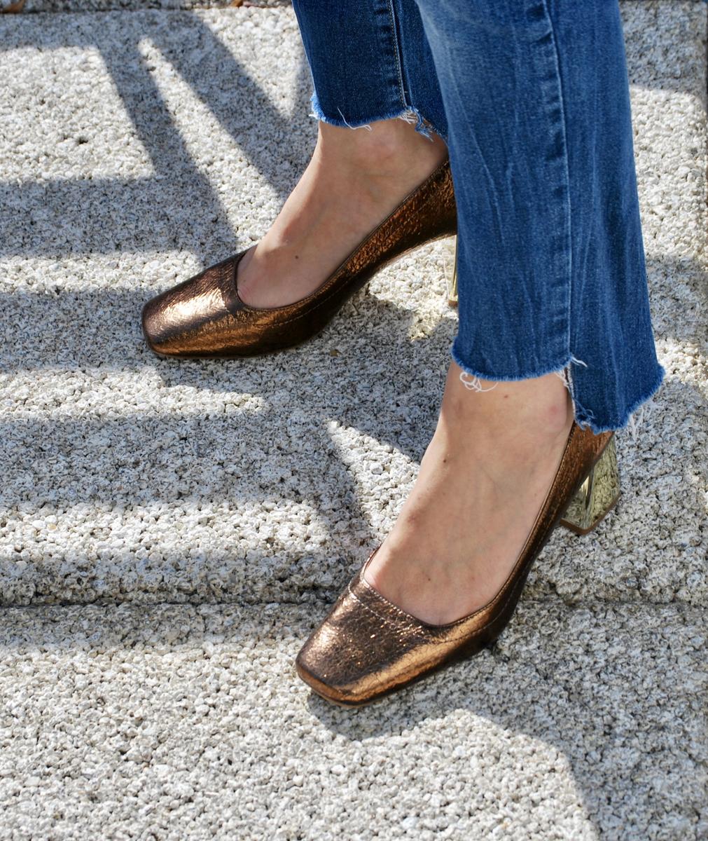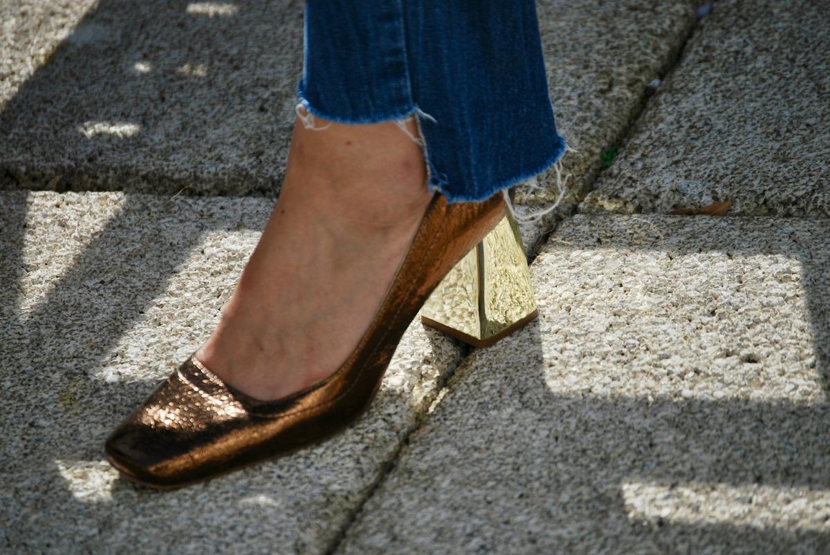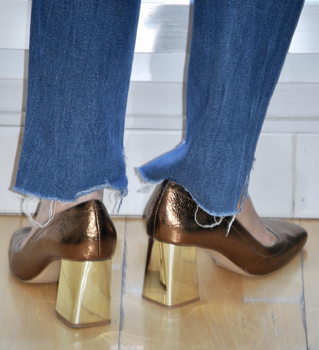 Se trata de un salón en piel cobre con tacón ancho dorado, son altos pero al llevar el tacón, como os digo, ancho no parece que vayas subida en un andamio, yo estuve con ellos tooooodooooo el día, cuando salí de trabajar, fui a la pelu, ellos conmigo, y llegué a casa como a las 21 horas y encantada con el resultado. Te los recomiendo, igual que recomiendo un restaurante, recomiendo unos zapatos… Una locura!!