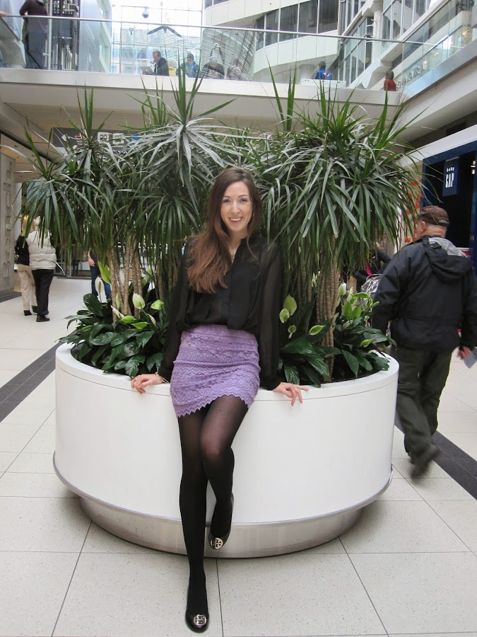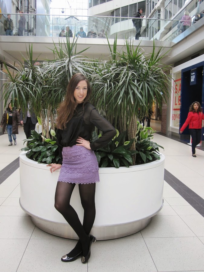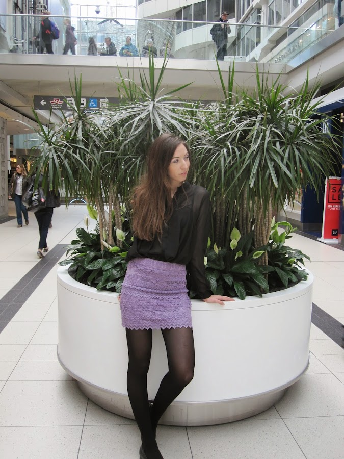 El motivo por el que elegí falda en vez de pantalón es porque realmente yo no iba de compras, si no de acompañante y asesora de mi amiga. Además, ya fui al Mall esta semana. Consideré que usando falda con medias, evitaría la tentación de seguir de shopping y centrarme en mi amiga.