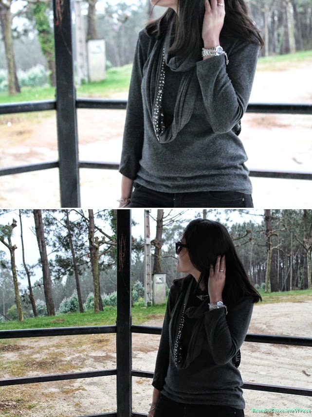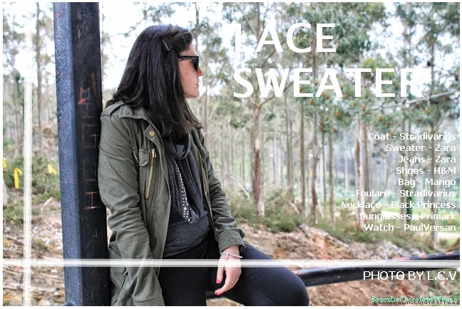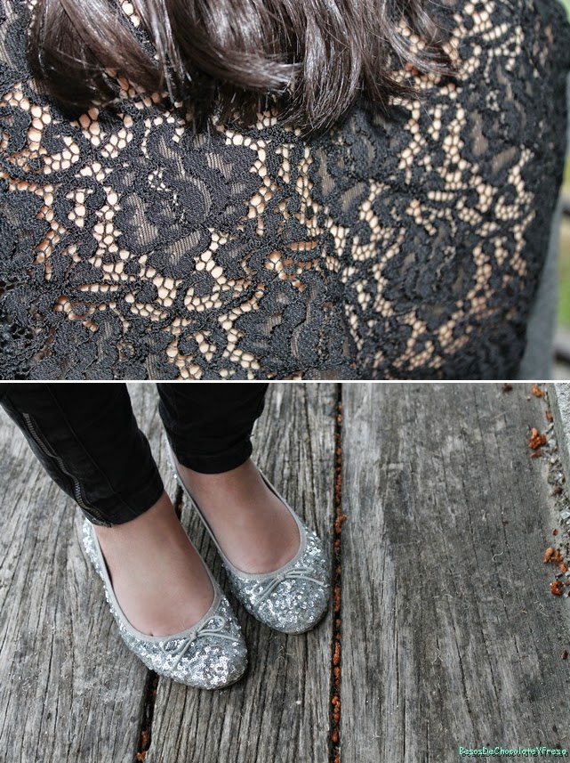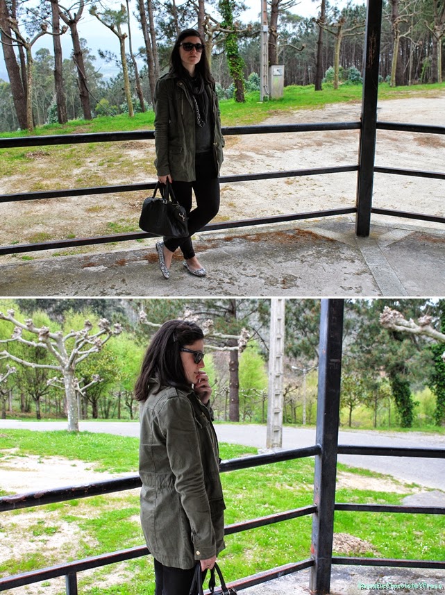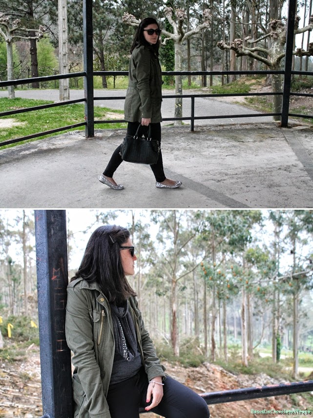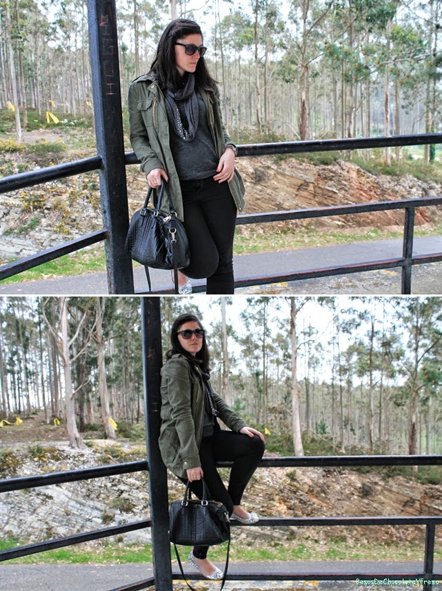 Para esta ocasión llevo mi nuevo sweater en gris y encaje negro por la espalda que lo hace super original y a la vez sexy dejando entrever el sujetador. Jeans negros, parka verde militar, bailarinas de brillos plateadas para hacer contraste y como complementos bolso tote negro, foulard de tachuelas en gris y collar rígido plateado de serpiente.