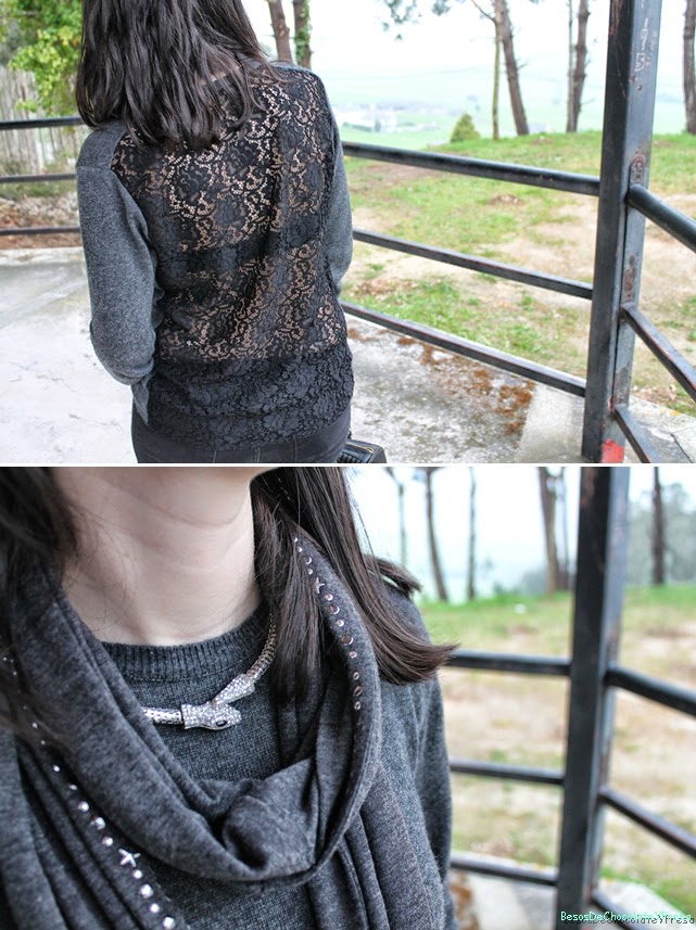 For this occasion I wear my new sweater in gray and black lace in the back that makes it super original and sexy bra instead hinting. Jeans black, military green parka, dancers silvery brightness to contrast and black tote bag as accessories, studded scarf in gray and silver snake necklace rigid.