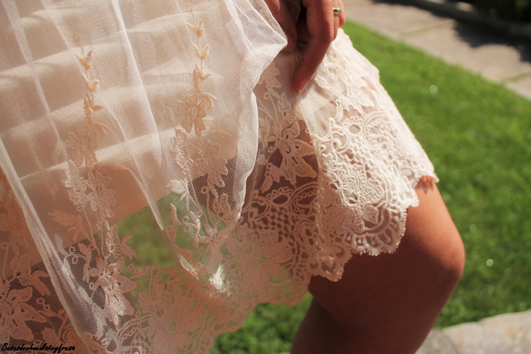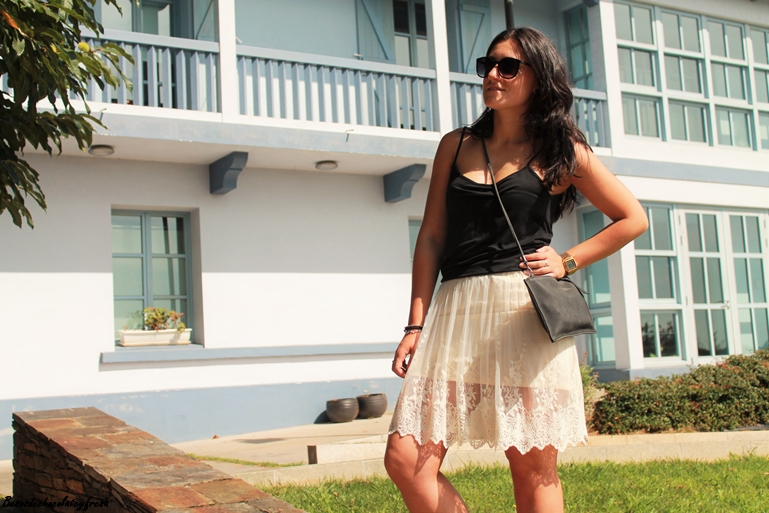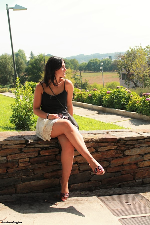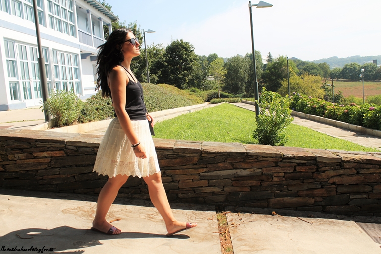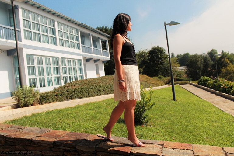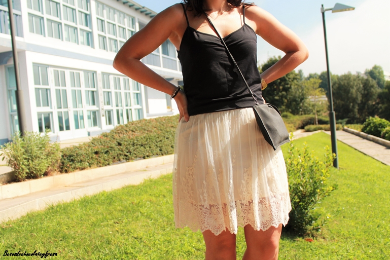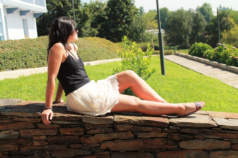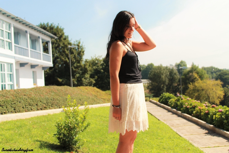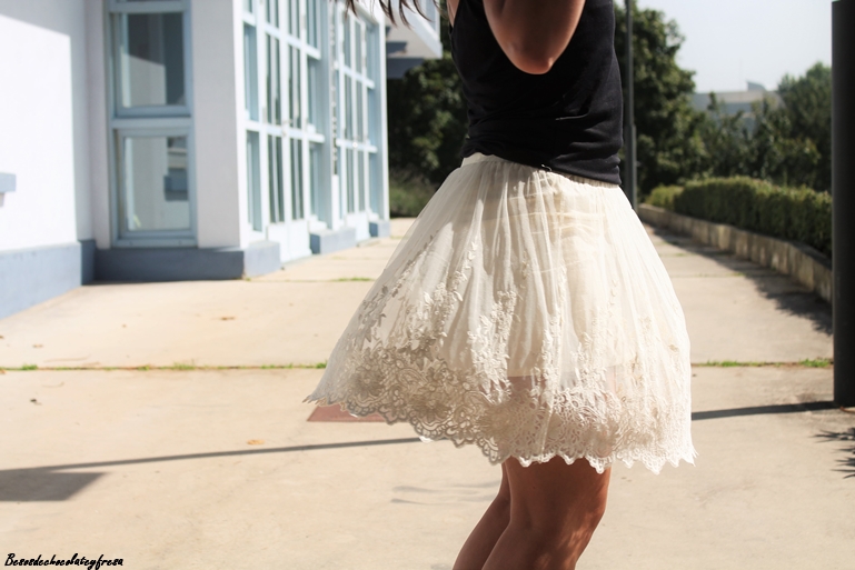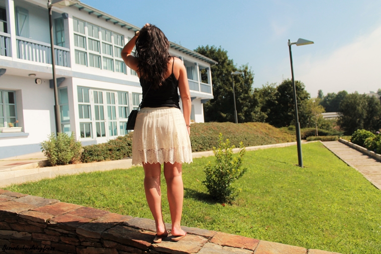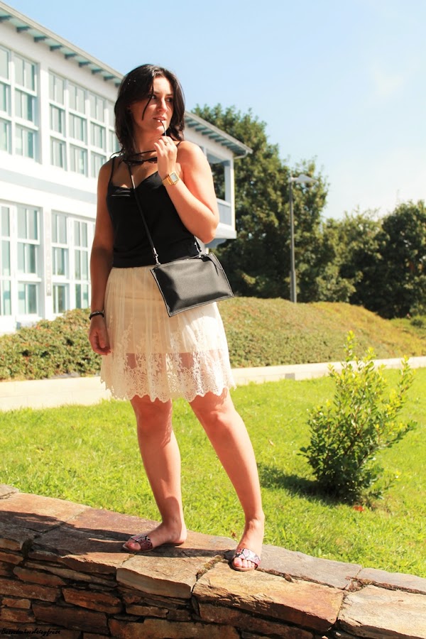 En esta ocasión llevo falda de encaje color crema con camiseta básica negra y de tirantes para darle todo el protagonismo a la parte de abajo. Como complementos bolso en negro y palas en color rojo y negro. ¿Qué os parece?
